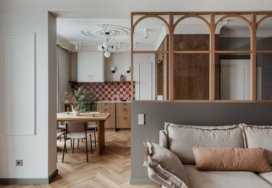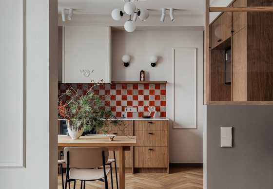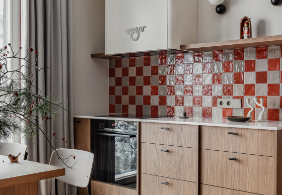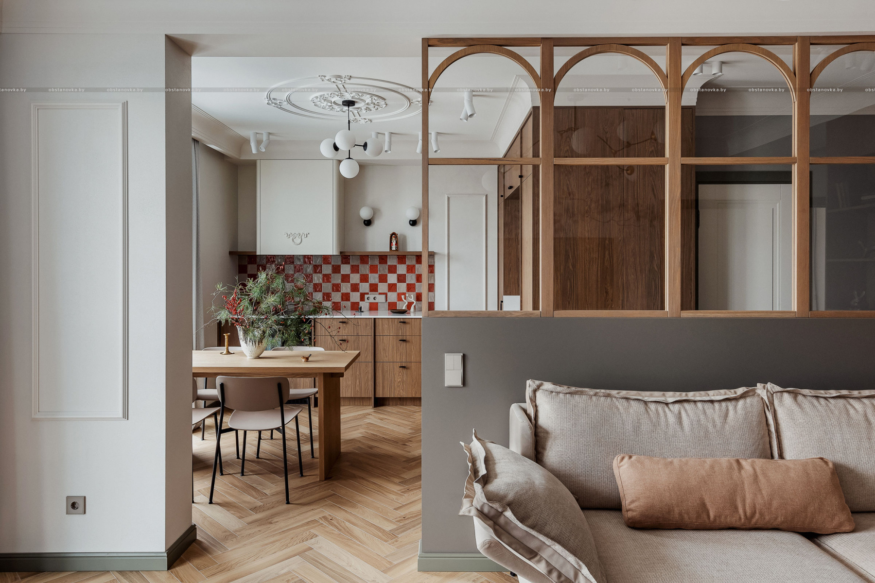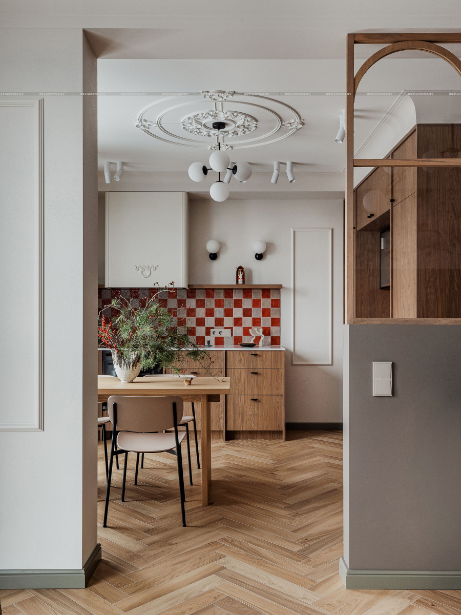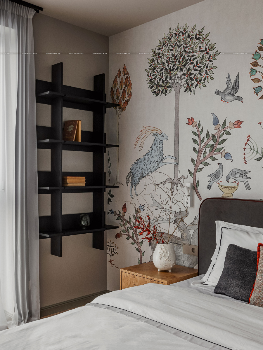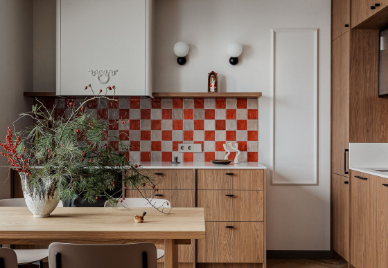 Квартира наполнена отсылками к парковым аллеям и садовым аркам, светильникам с плафонами в виде уличных фонарей и сказочным животным из заколдованного леса, поселившимся в спальне, а также к плитке в шашечку, напоминающей о мужчинах, играющих в шахматы в парке.