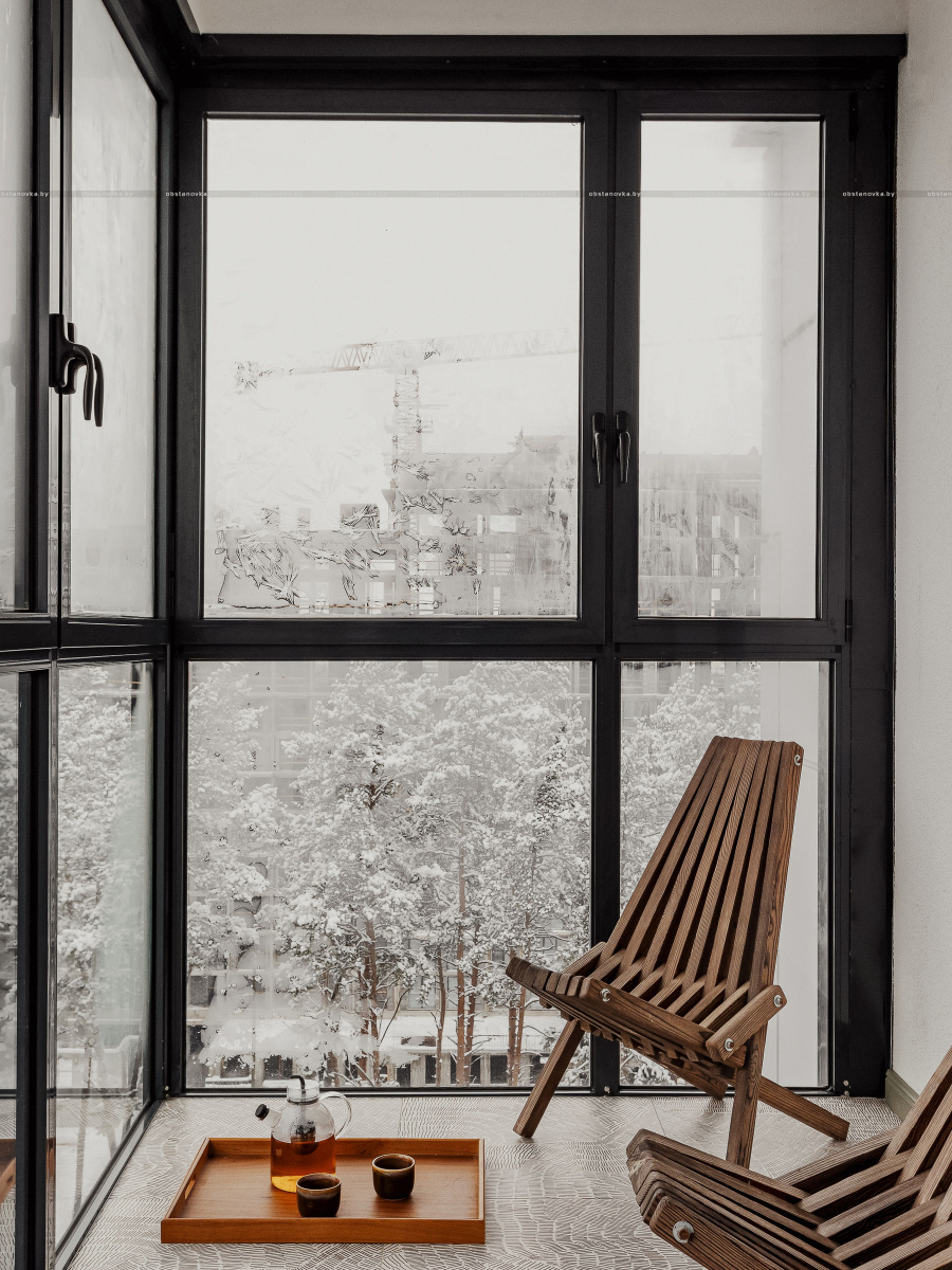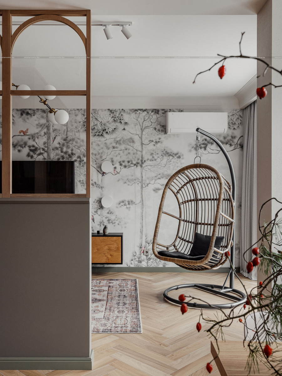 Образ дополняют кресло-качеля из натурального ротанга для любования видом из окна, плитка на балконе с рисунком упавших сосновых иголочек и бордовые детали, словно спелые лесные ягоды.