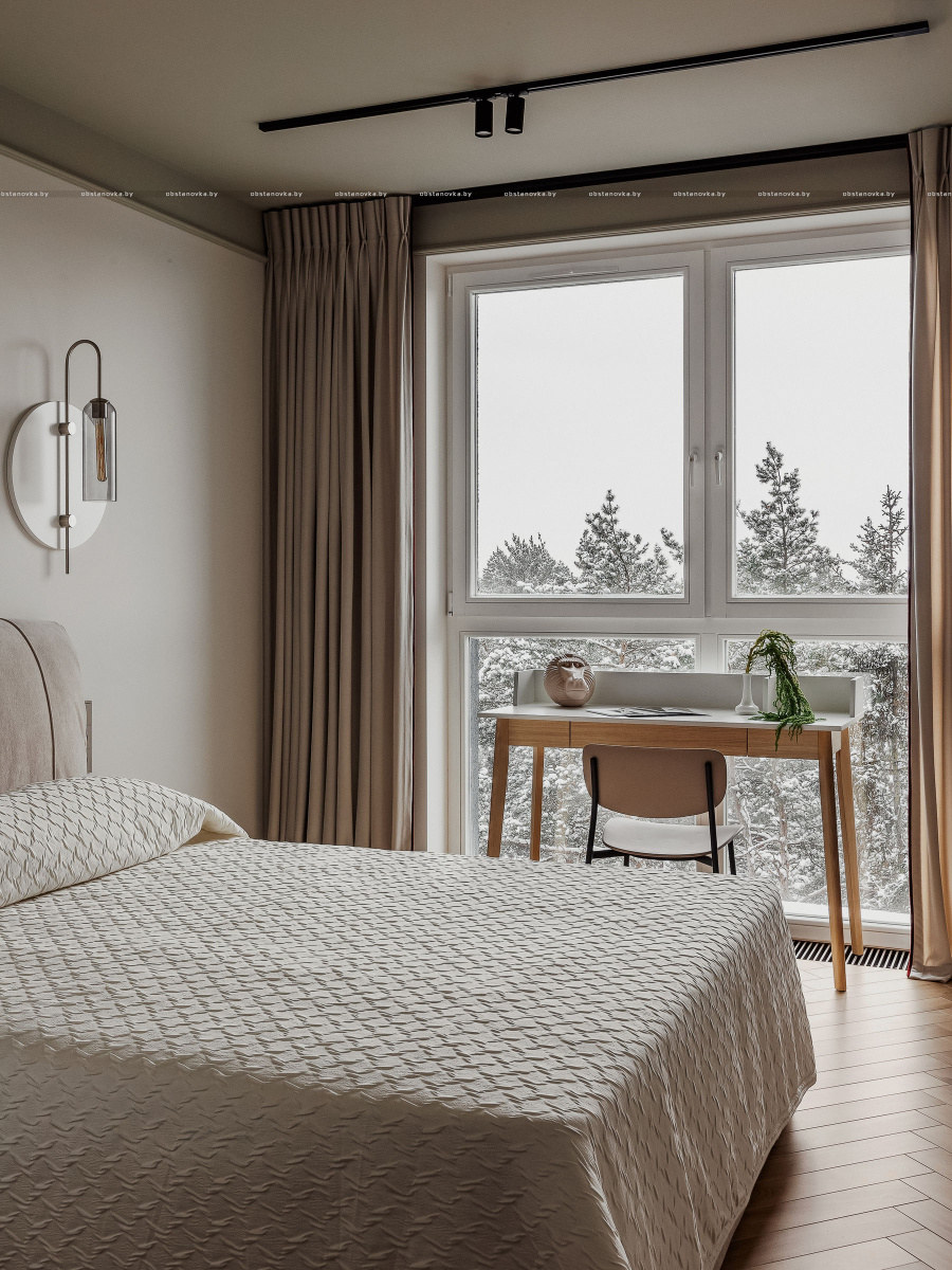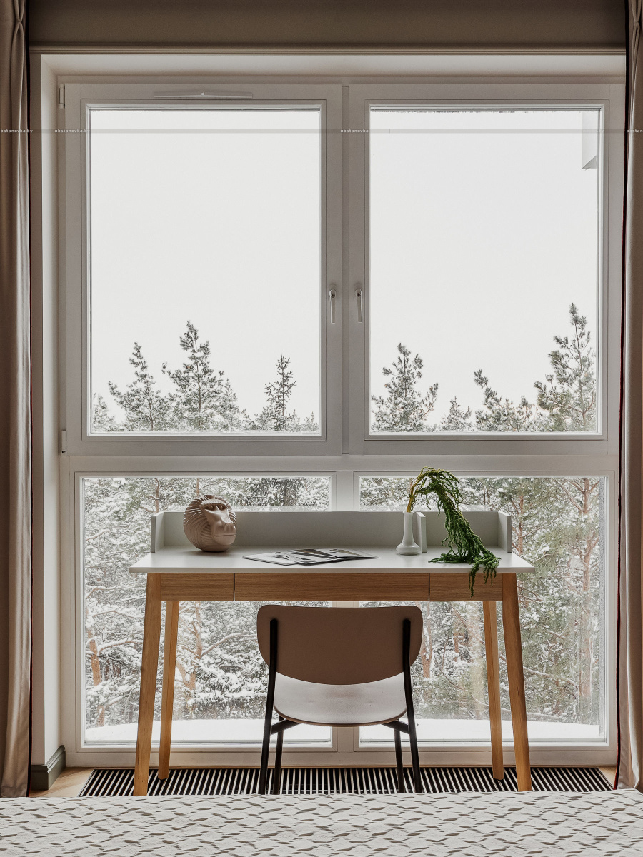 Квартира расположена на 11 этаже с потрясающим видом на сосновый лес, при этом дом находится в черте города, давая ощущение, что находишься между небом и соснами, наблюдаешь за их настроением в разную погоду, наслаждаясь их графичными линиями и гибкостью.