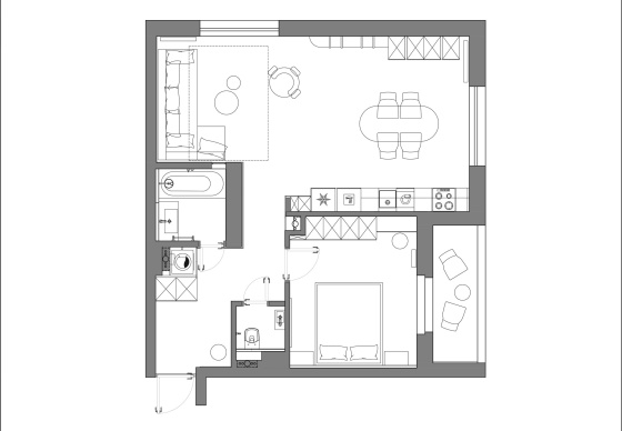 Объединённое пространство гостиной и кухни задумывалось как место для общения и приёма гостей.