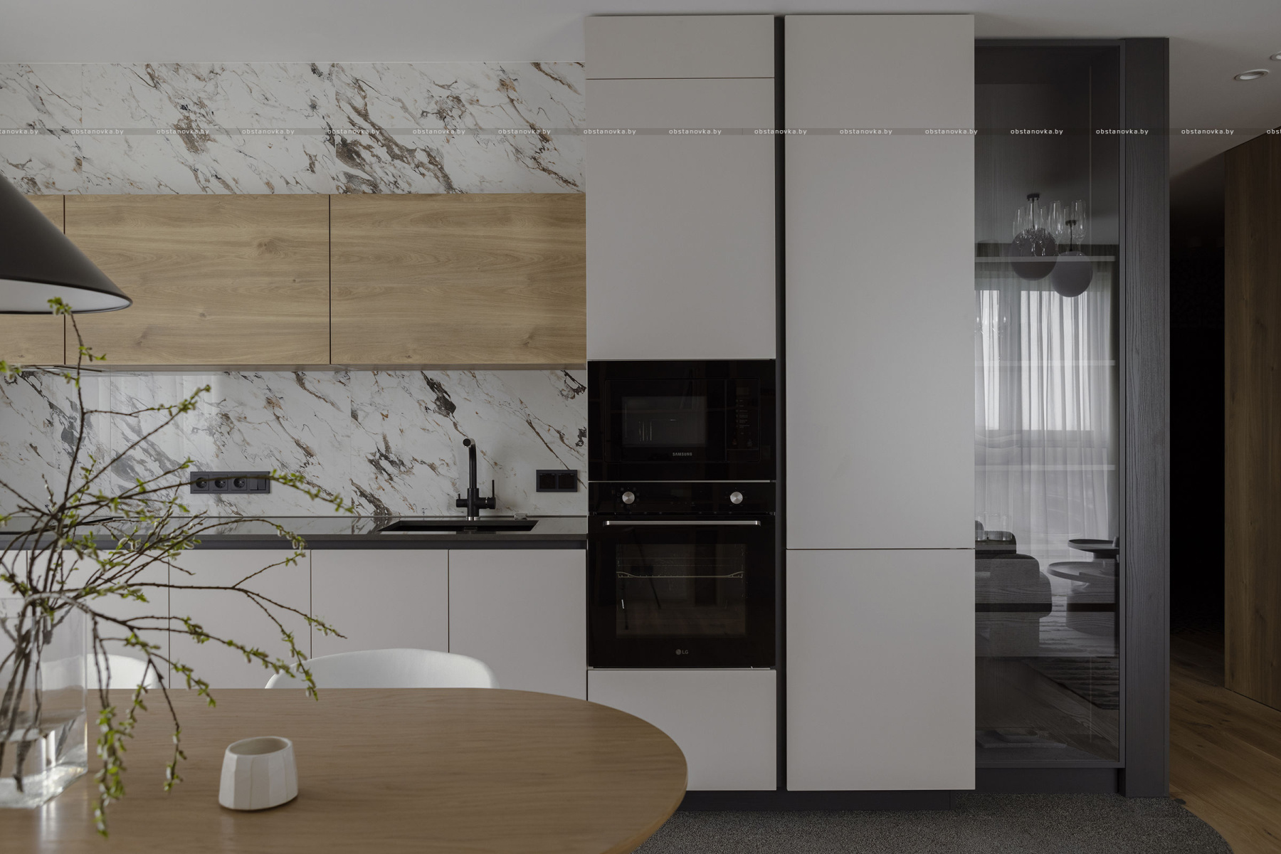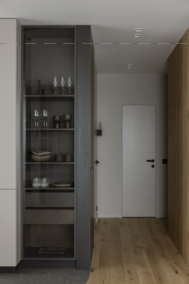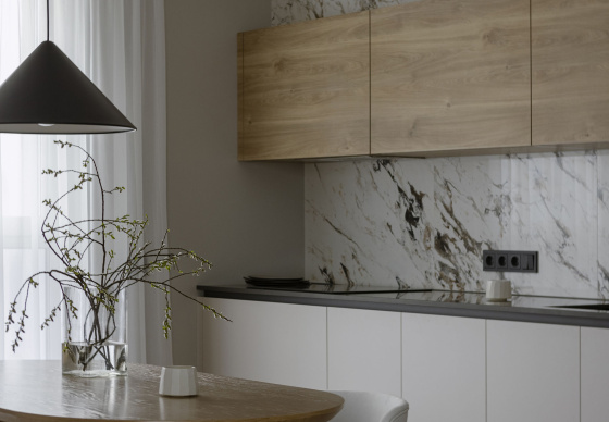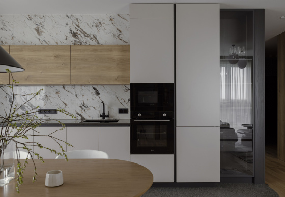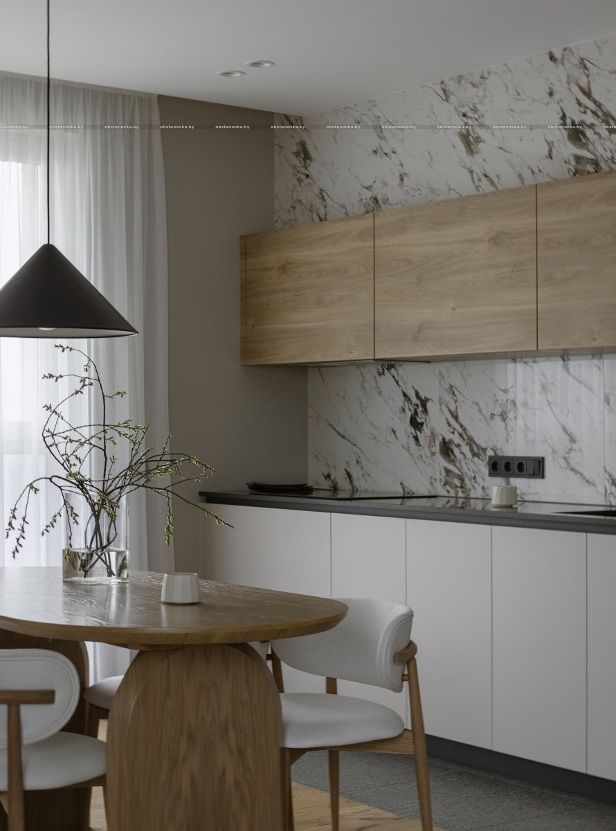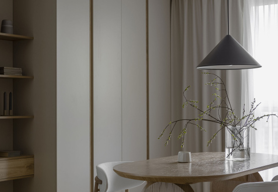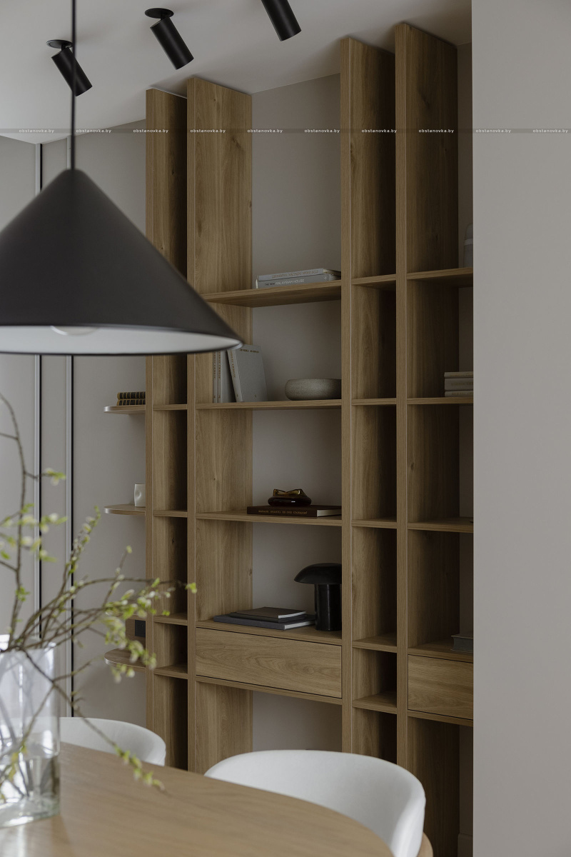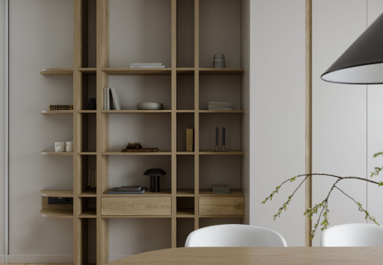 В этом проекте натуральное дерево использовано с особым вниманием к текстуре и линиям, что придаёт помещениям ощущение теплоты и уюта, оставаясь при этом современным и минималистичным.