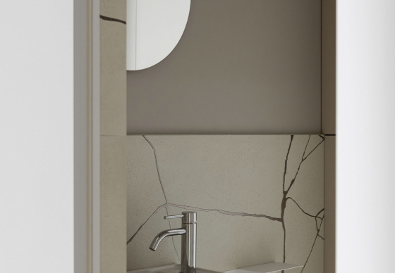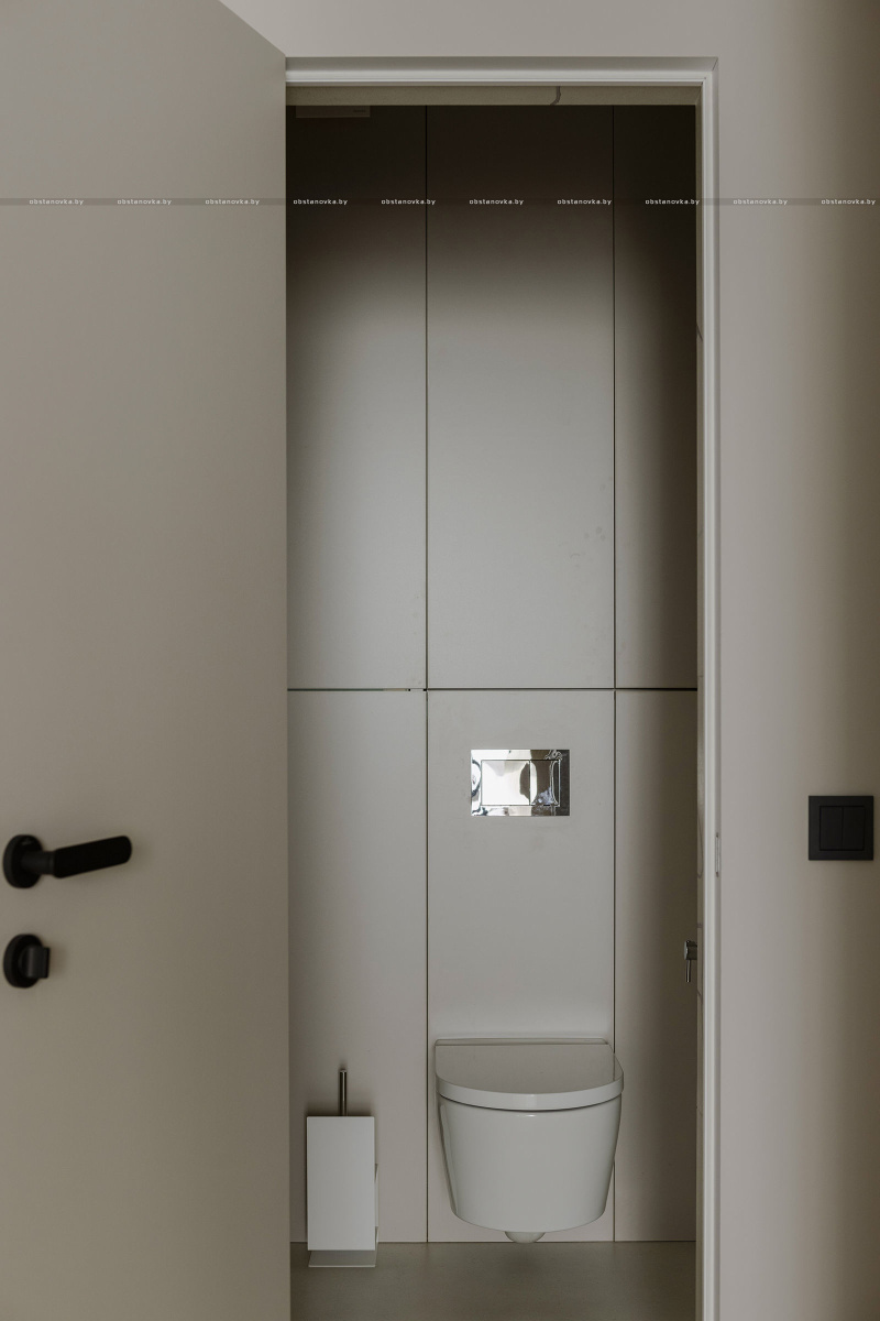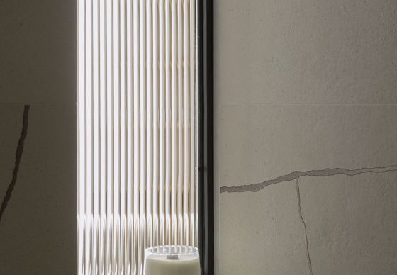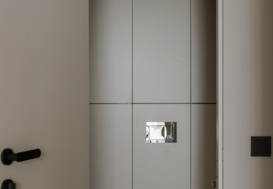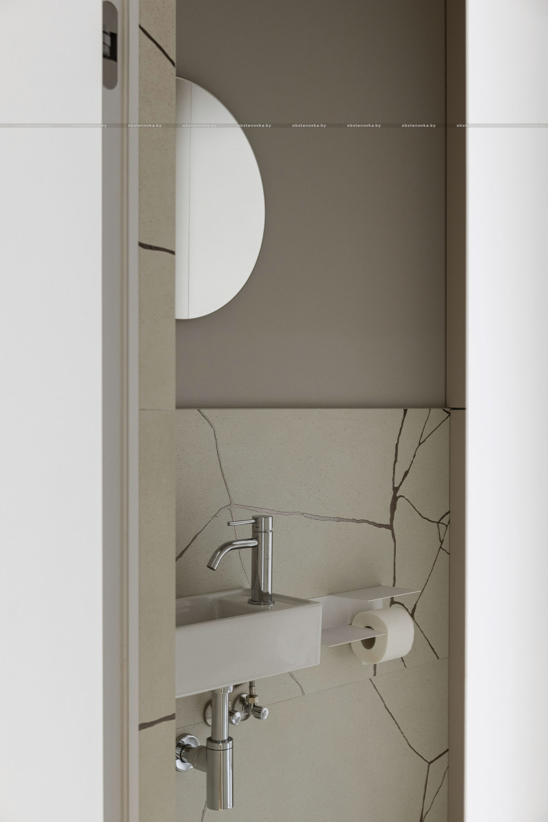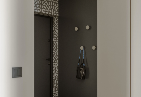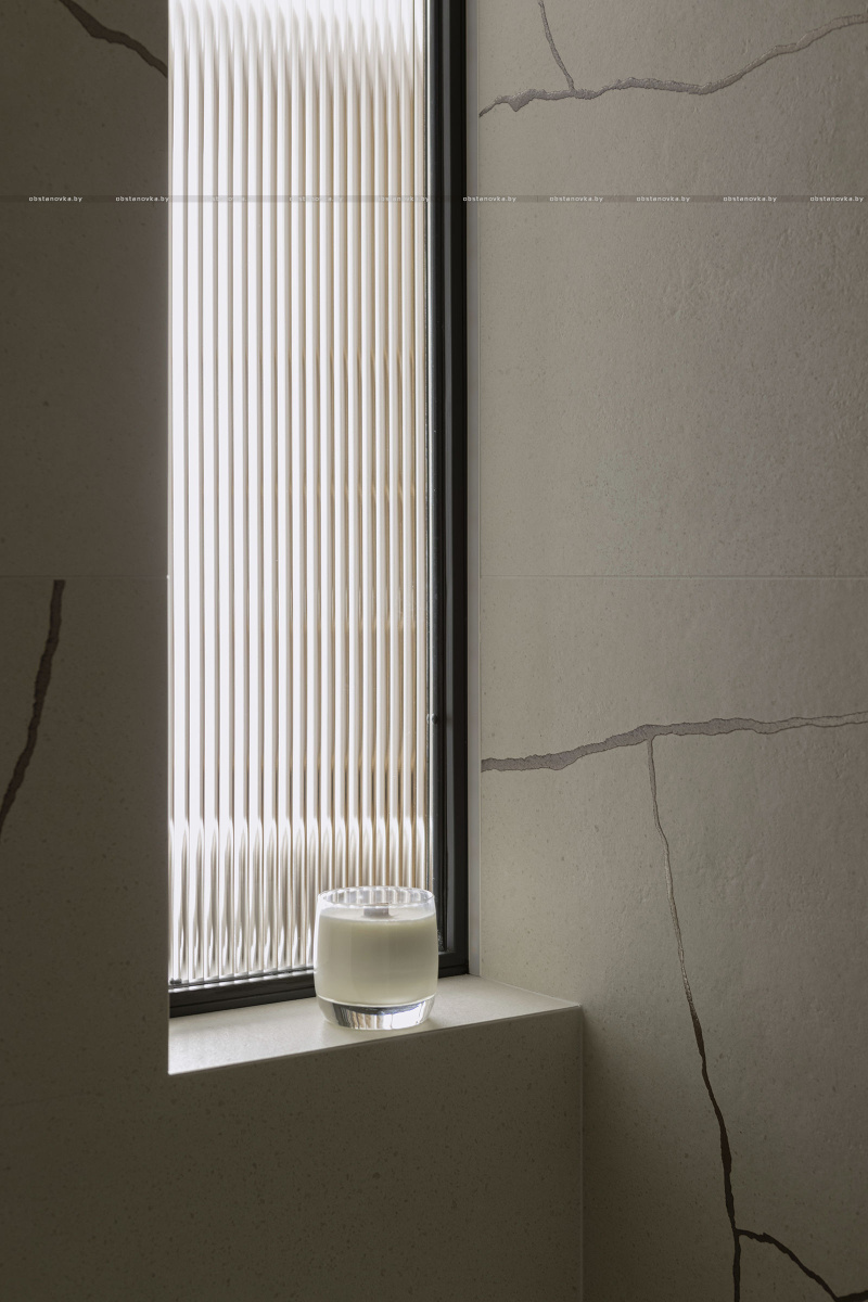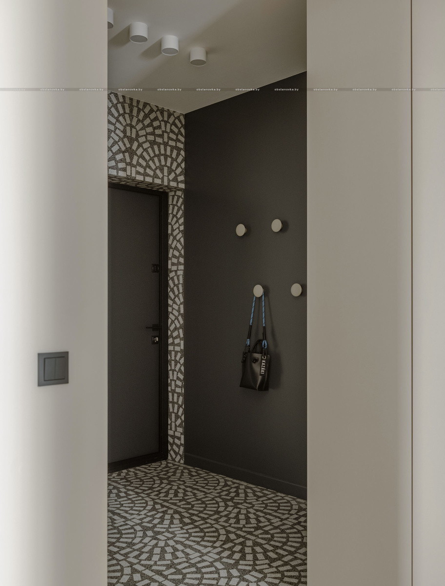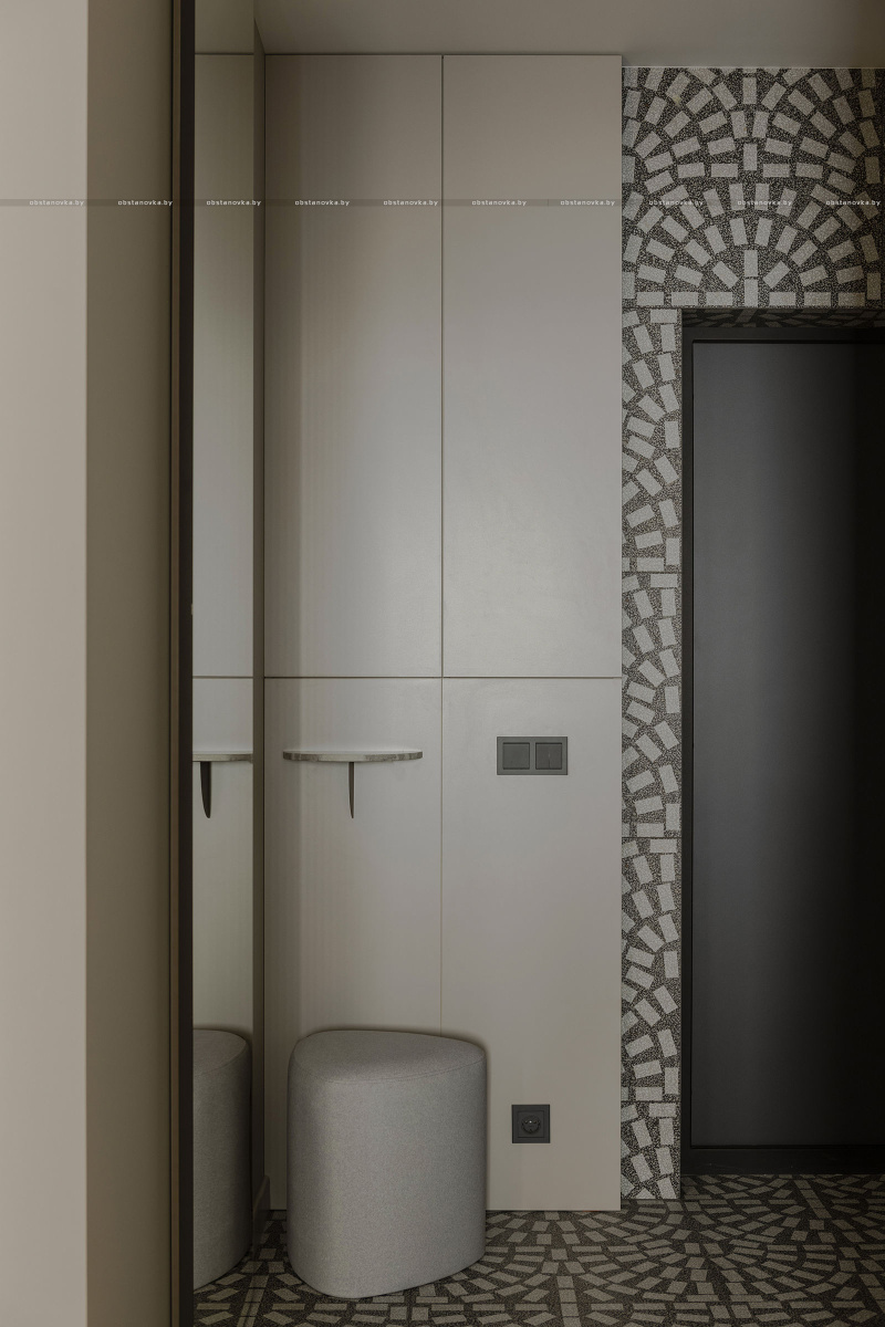В зоне прихожей мы использовали керамогранит с ярко выраженными текстурами и рисунками — это настоящий тренд. «Арочный» принт добавляет динамики и игры в традиционно нейтральное пространство, делая его уникальным и запоминающимся.