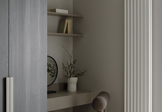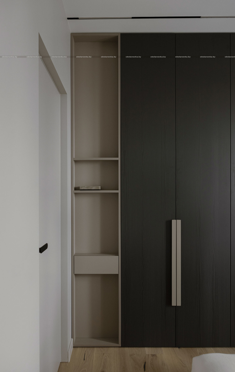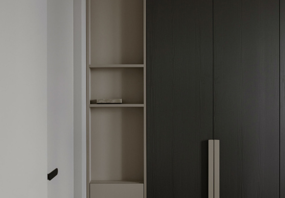 Встроенные шкафы с продолговатыми вертикальными ручками обеспечивают много места для хранения и добавляют интерьеру визуальную строгость и гармонию.