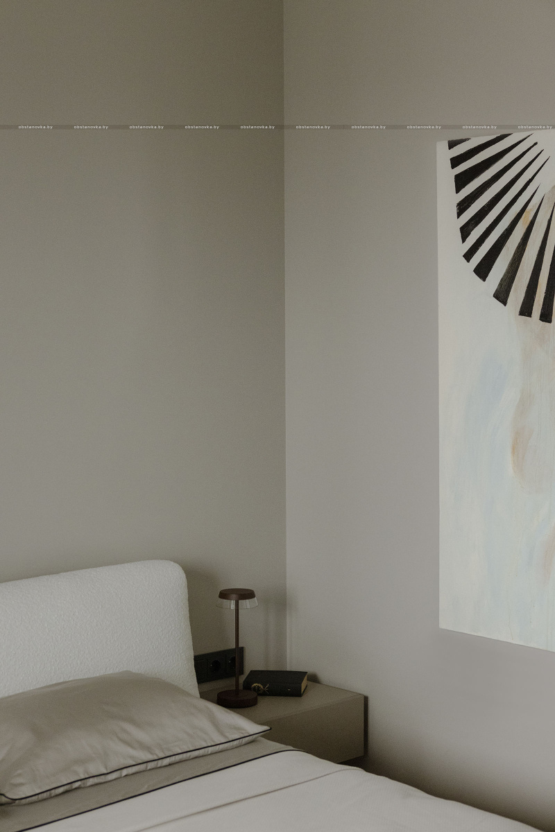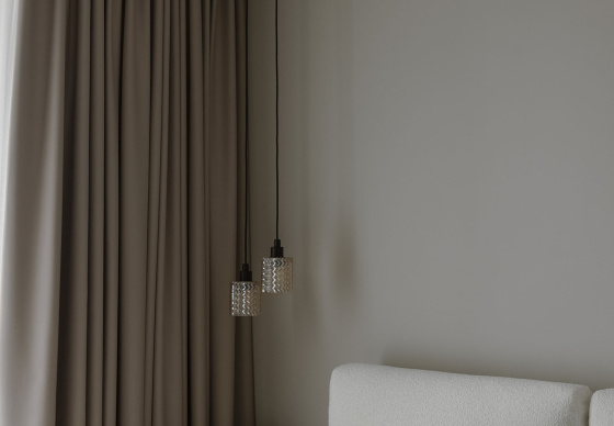 Здесь мы использовали светильники, которые акцентируют внимание на важных зонах, не перегружая пространство. Высокие плотные шторы продолжают общую палитру, придают спальне уют и приватность.