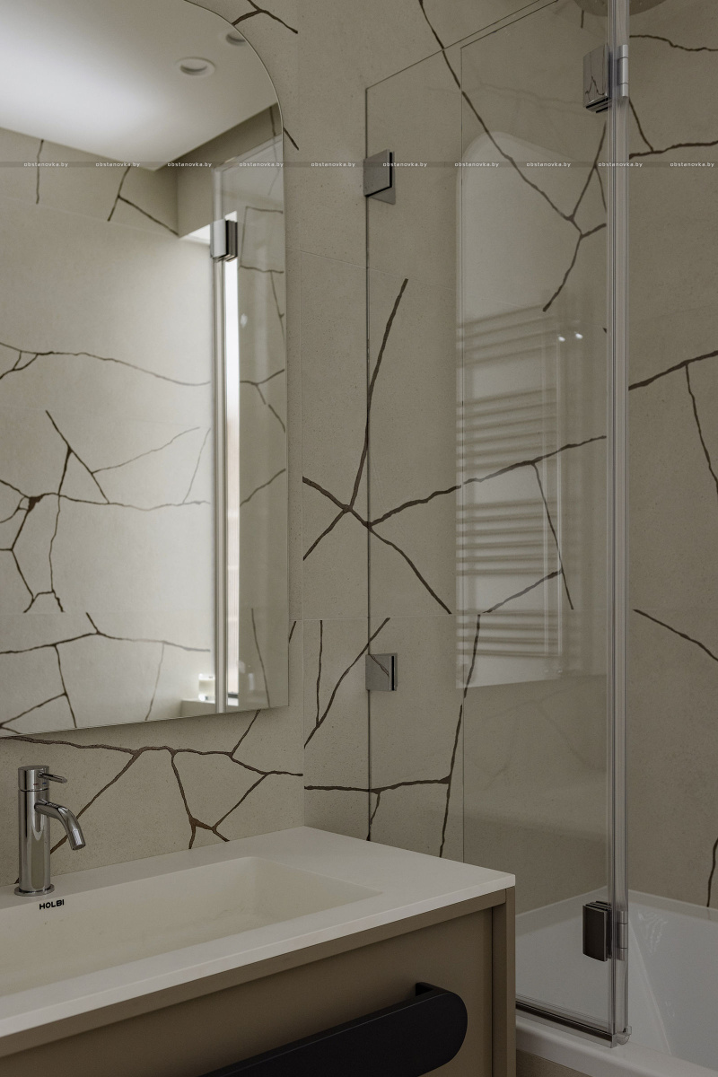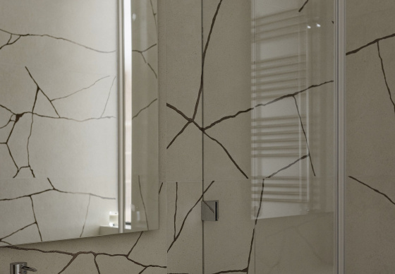 Керамогранит в стиле Kintsugi символизирует красоту в несовершенстве, украшая полы и стены ванной комнаты, придавая им глубину и текстуру.
