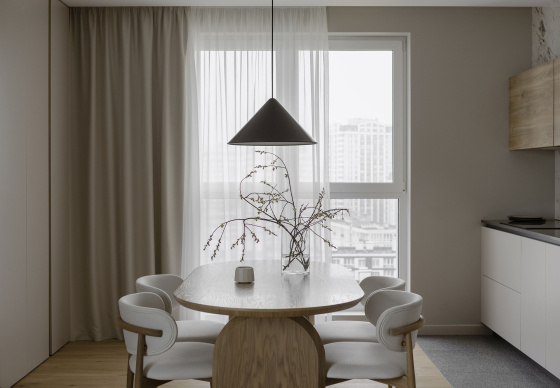 Интерьер балансирует между минимализмом и теплом натуральных материалов, создавая модное и стильное пространство. Мы сочетали закрытые и открытые зоны, нестандартные решения с элементами, которые привносят свет и воздух в интерьер, и тщательно продумали выбор фактур и отделочных материалов.