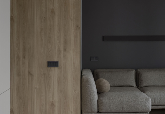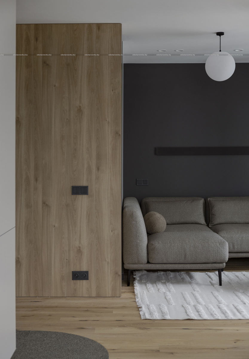 Дизайн интерьера играет на контрасте светлых, спокойных тонов с акцентными деталями в глубоких антрацитовых оттенках, создавая уникальное и гармоничное пространство для жизни.