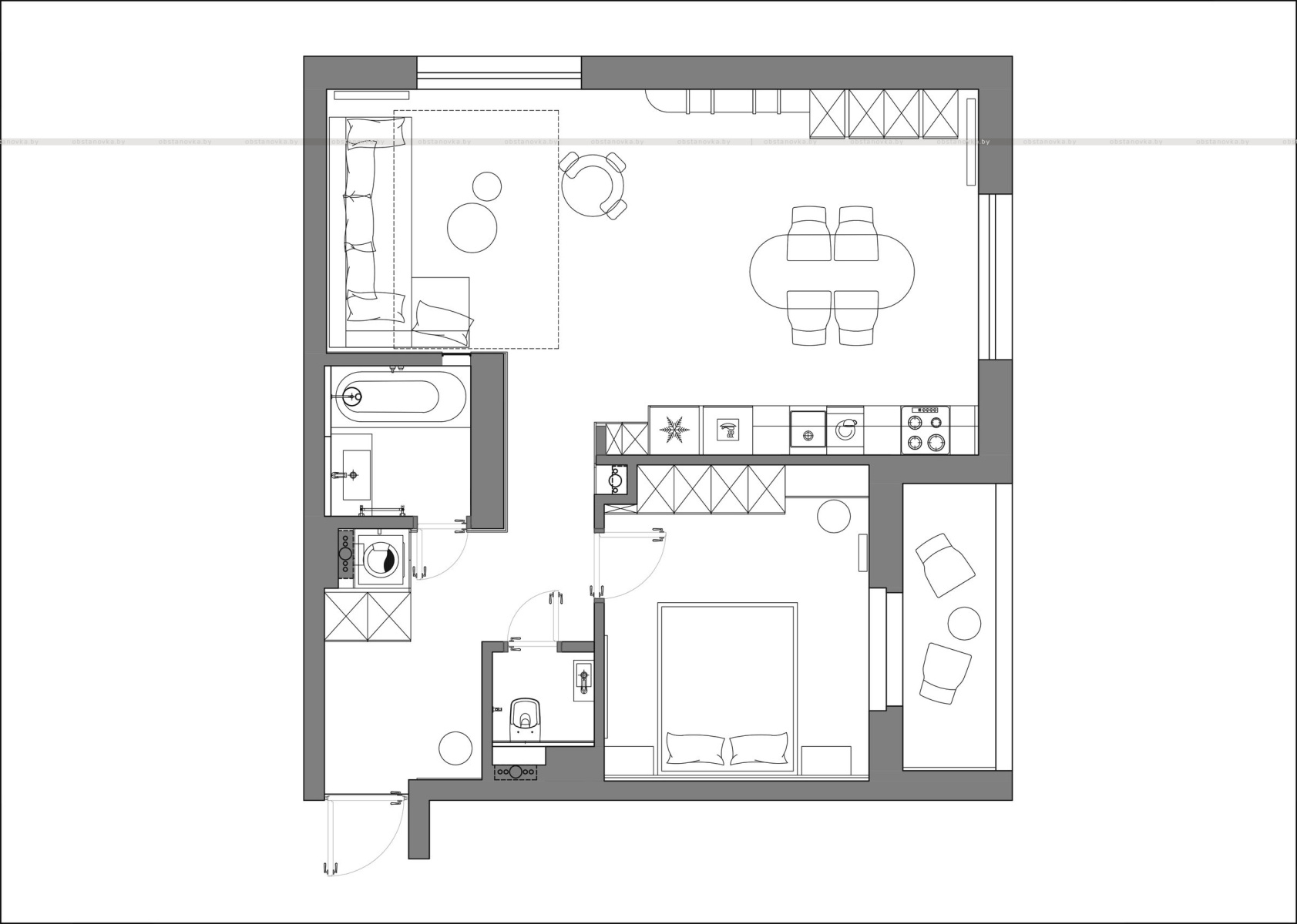 Это решение отражает тенденцию к созданию более открытых, взаимосвязанных пространств, при этом оставаясь достаточно смелым и элегантным.