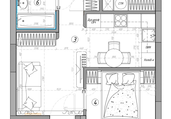 Самое важное тут было для заказчиков (молодая семейная пара) — уместить максимум по функциональным зонам в малое пространство (изначально 42 м²).