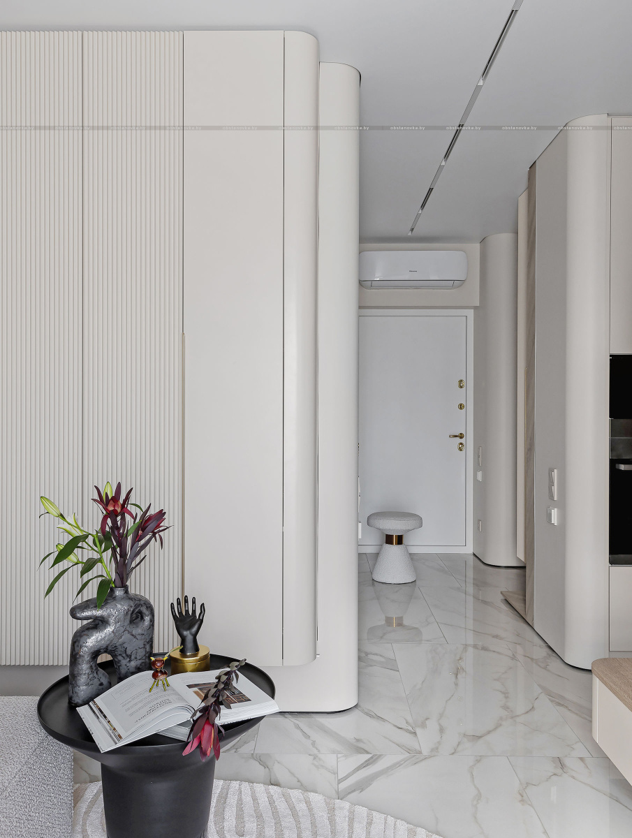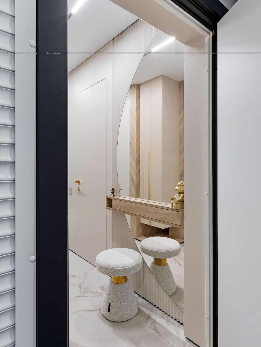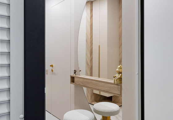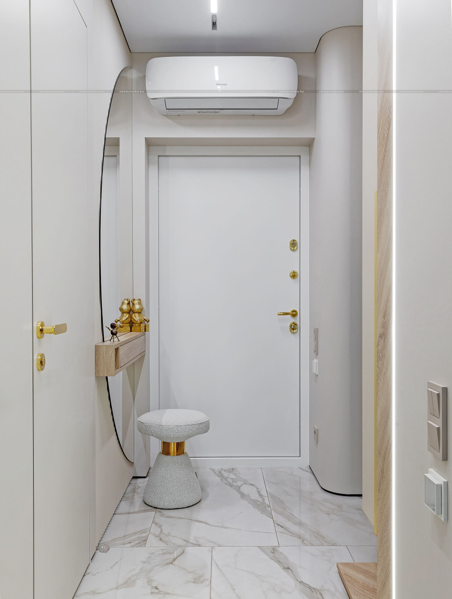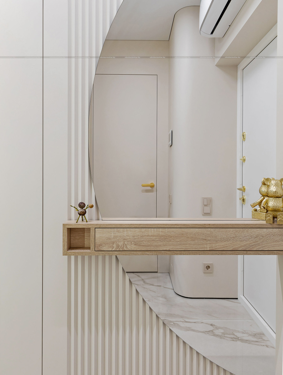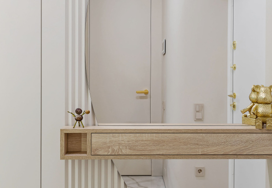 Светлый, современный, лаконичный, фактурный, ритмичный, функциональный, вместительный, разделённый, прямолинейный и плавный, и с деревом, и чуть-чуть с золотишком — вот этими словами и можно охарактеризовать этот интерьер.