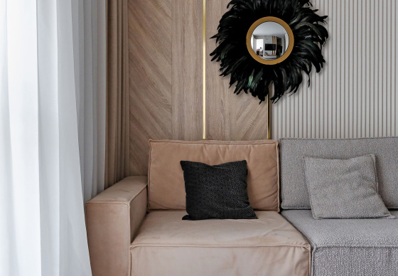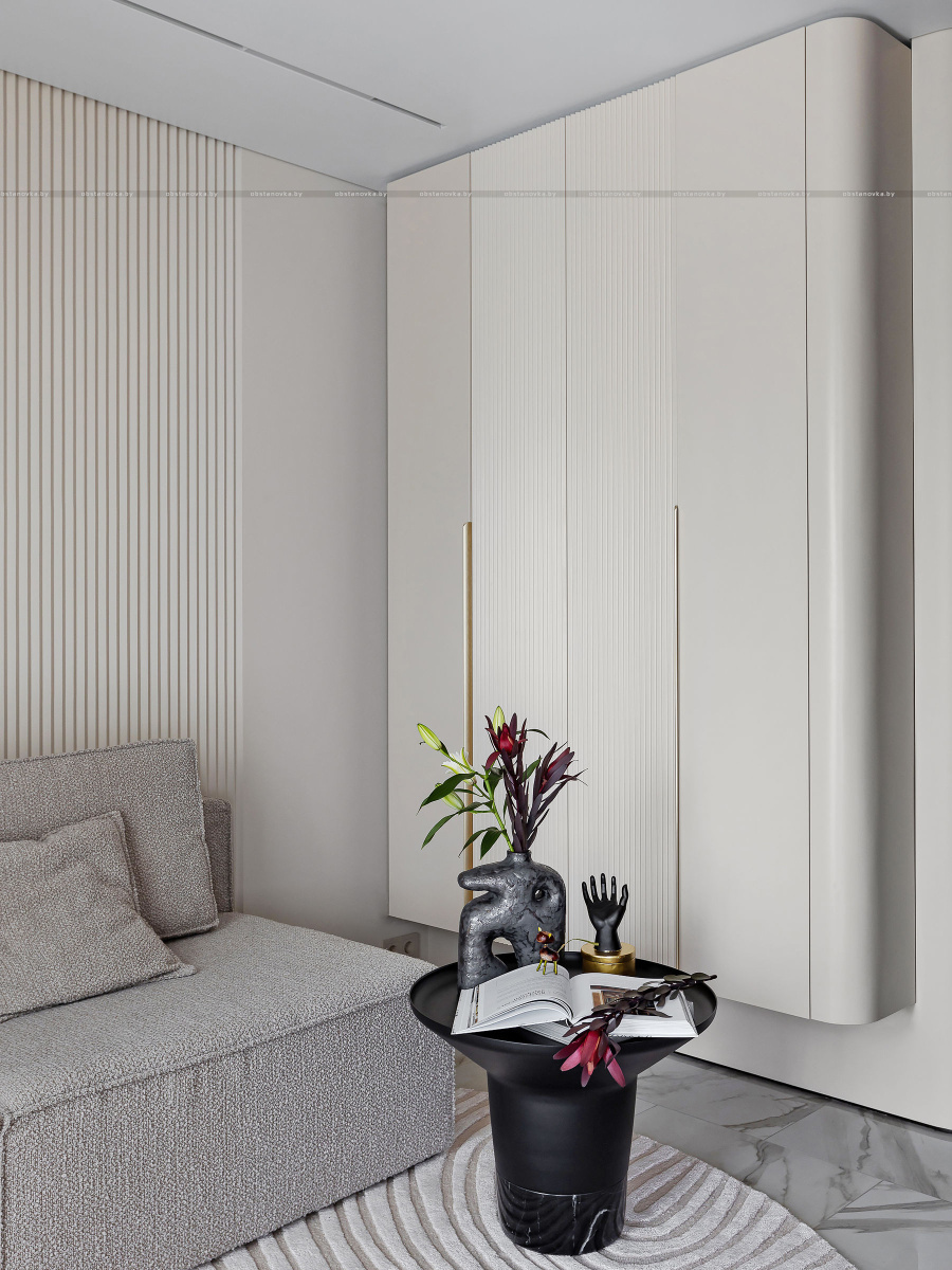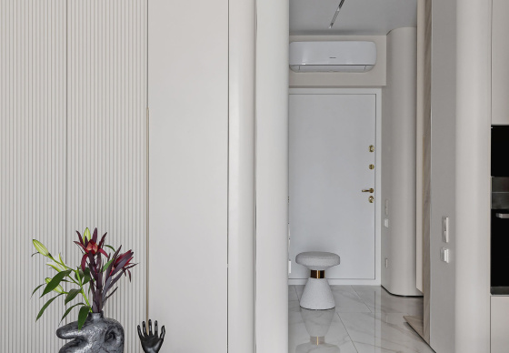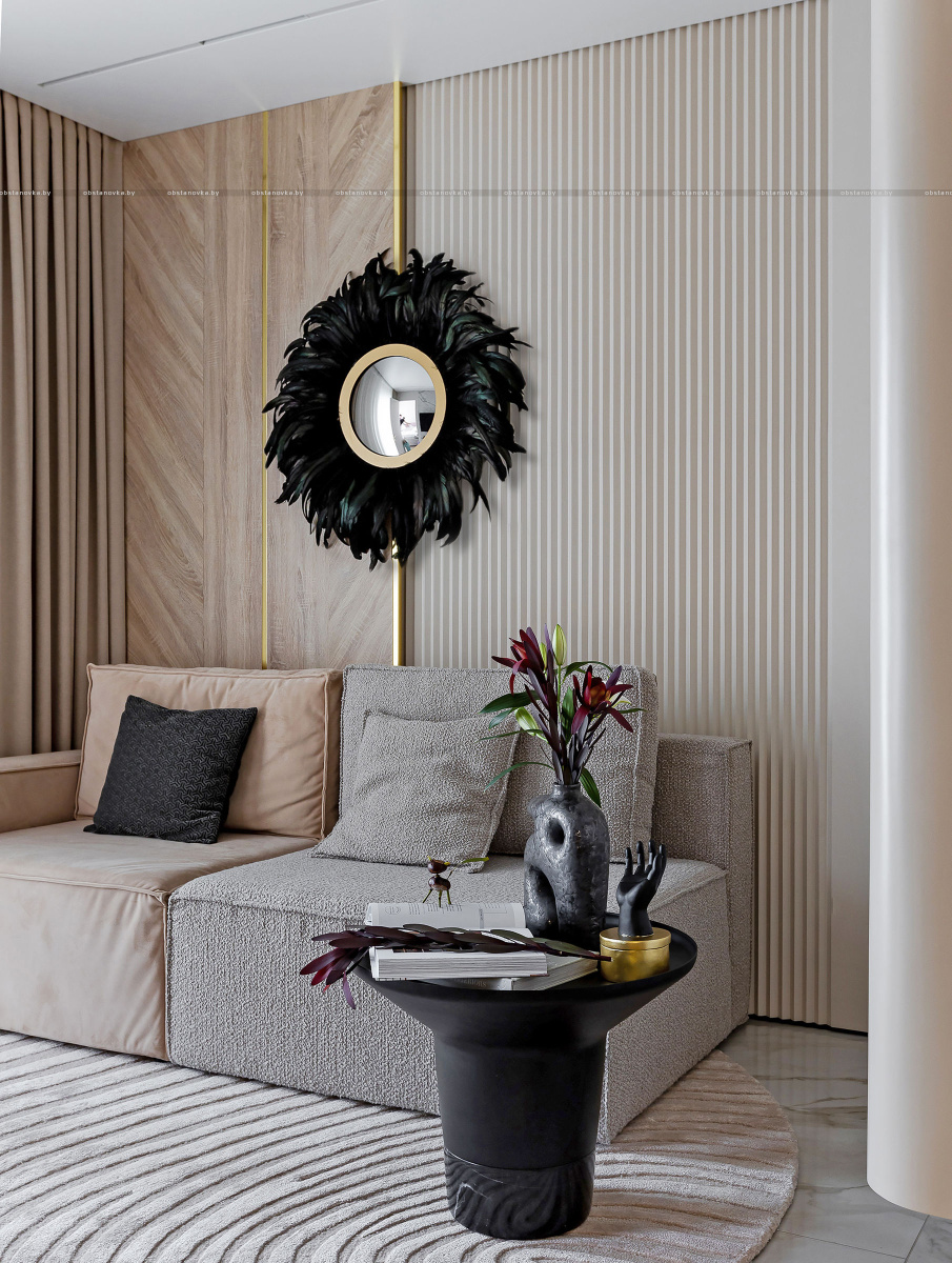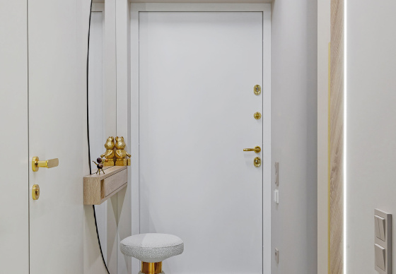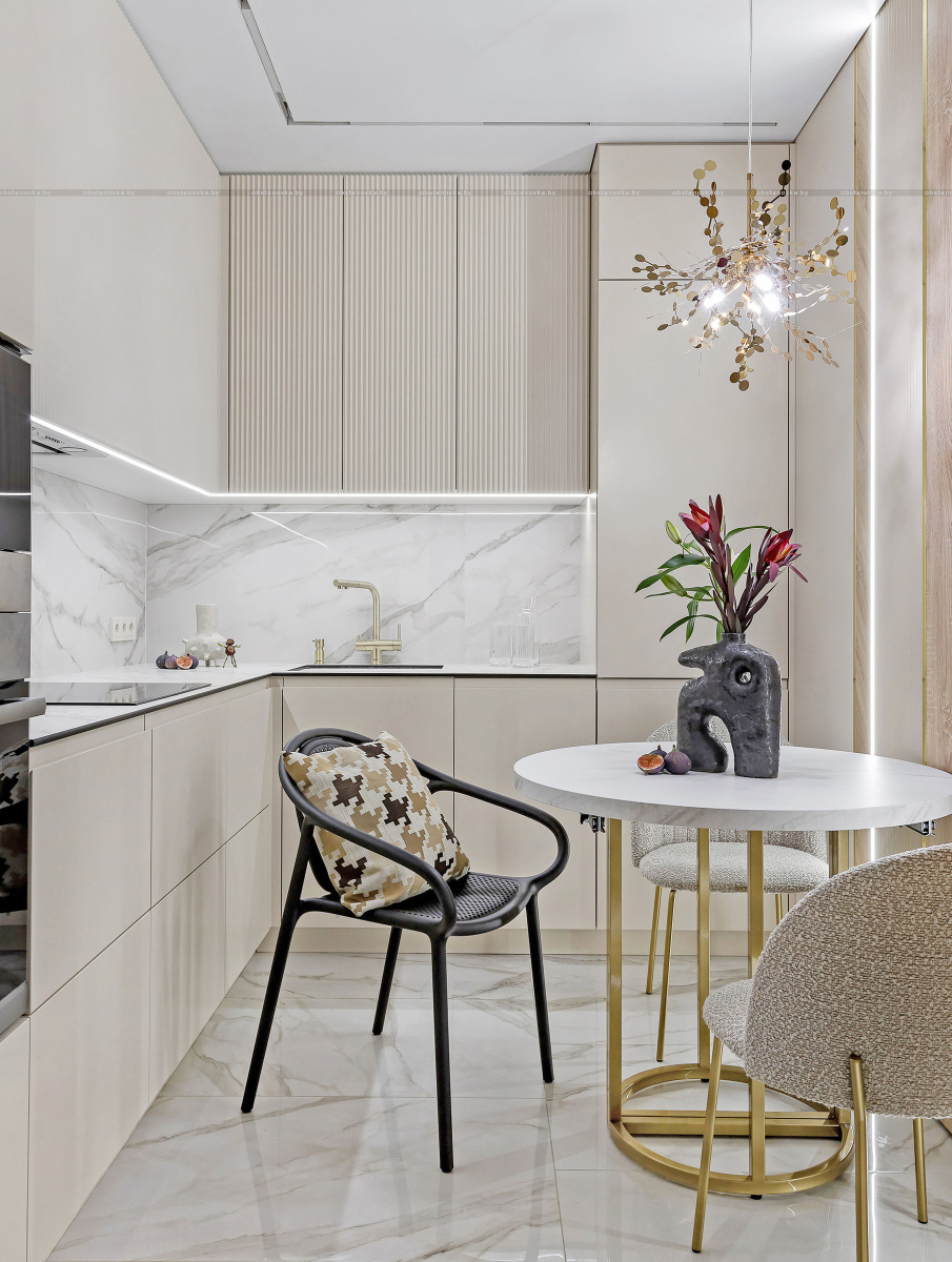Светлый, современный, лаконичный, фактурный, ритмичный, функциональный, вместительный, разделённый, прямолинейный и плавный, и с деревом, и чуть-чуть с золотишком — вот этими словами и можно охарактеризовать этот интерьер.