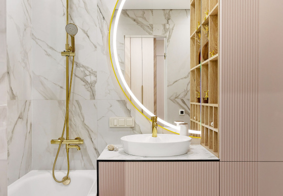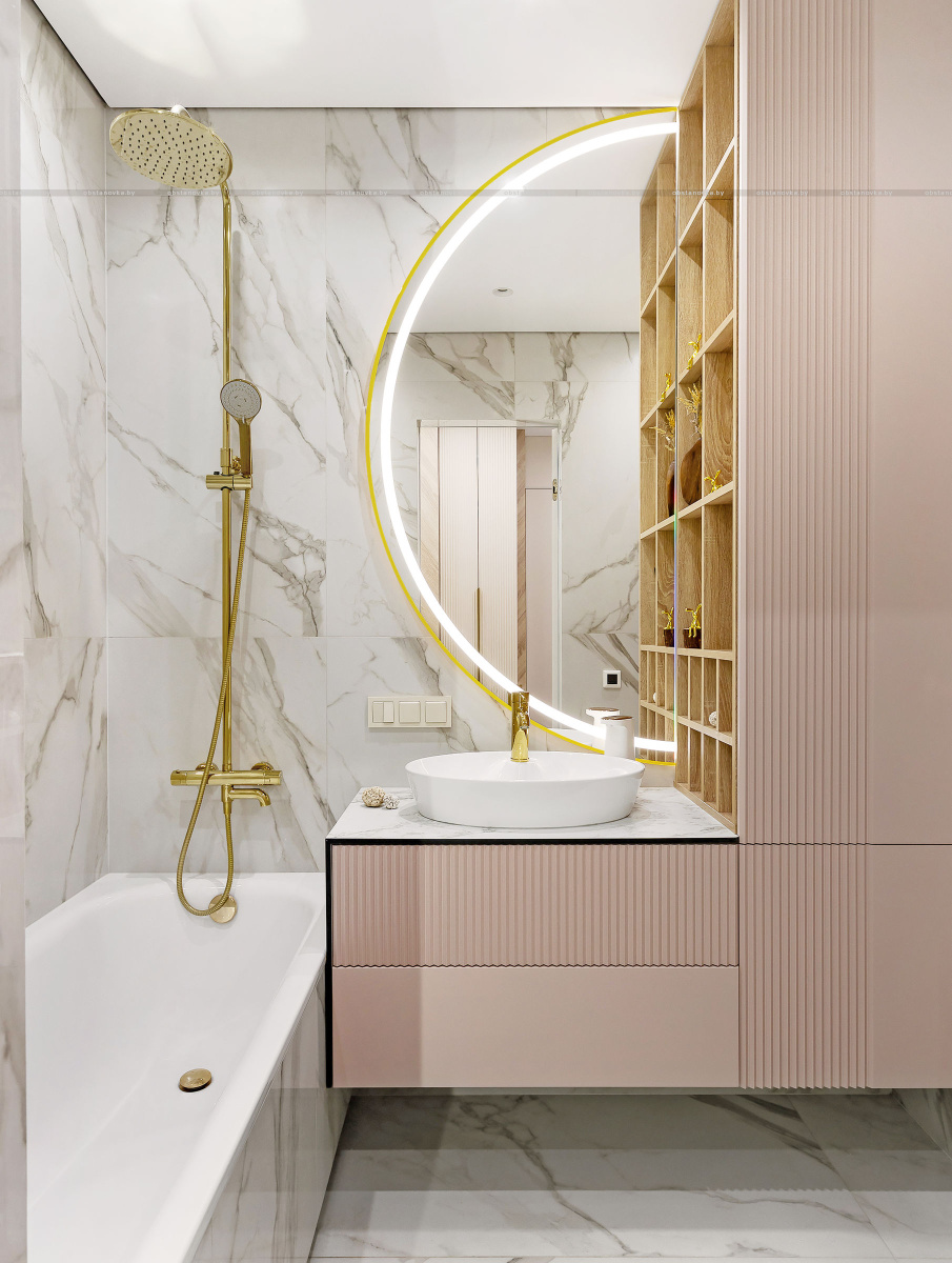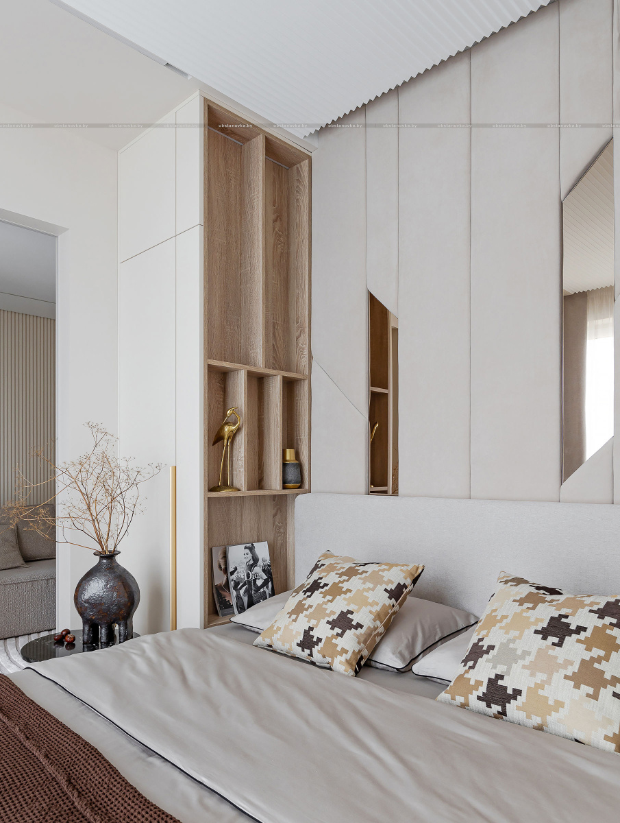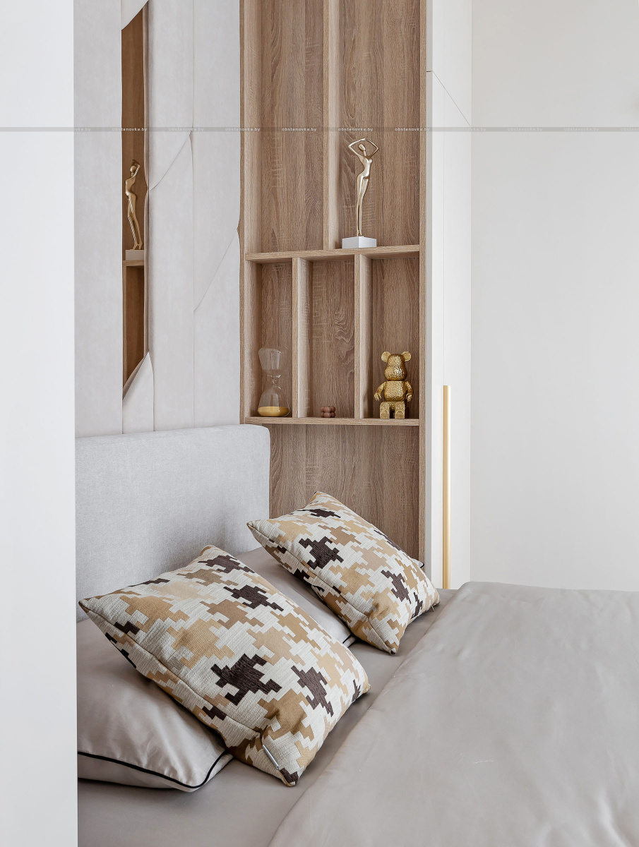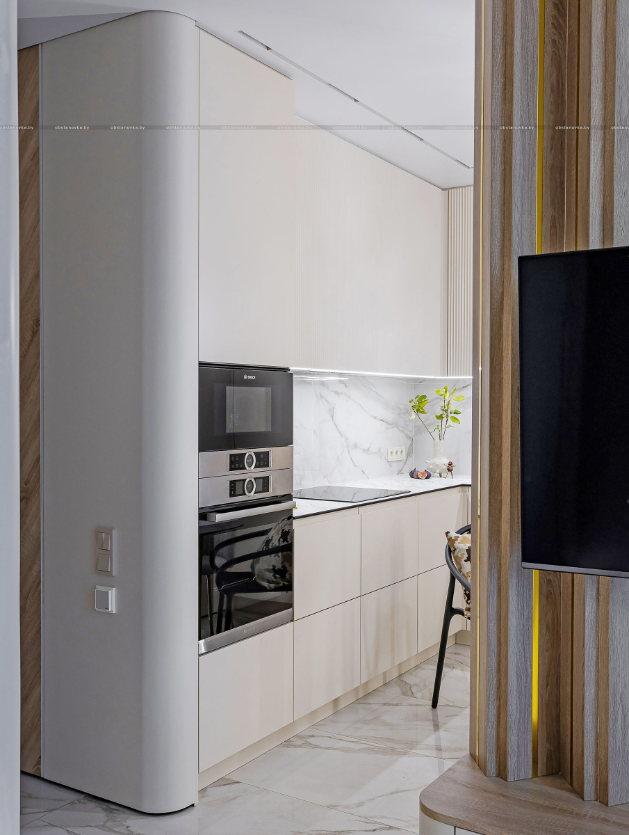 Светлый, современный, лаконичный, фактурный, ритмичный, функциональный, вместительный, разделённый, прямолинейный и плавный, и с деревом, и чуть-чуть с золотишком — вот этими словами и можно охарактеризовать этот интерьер.