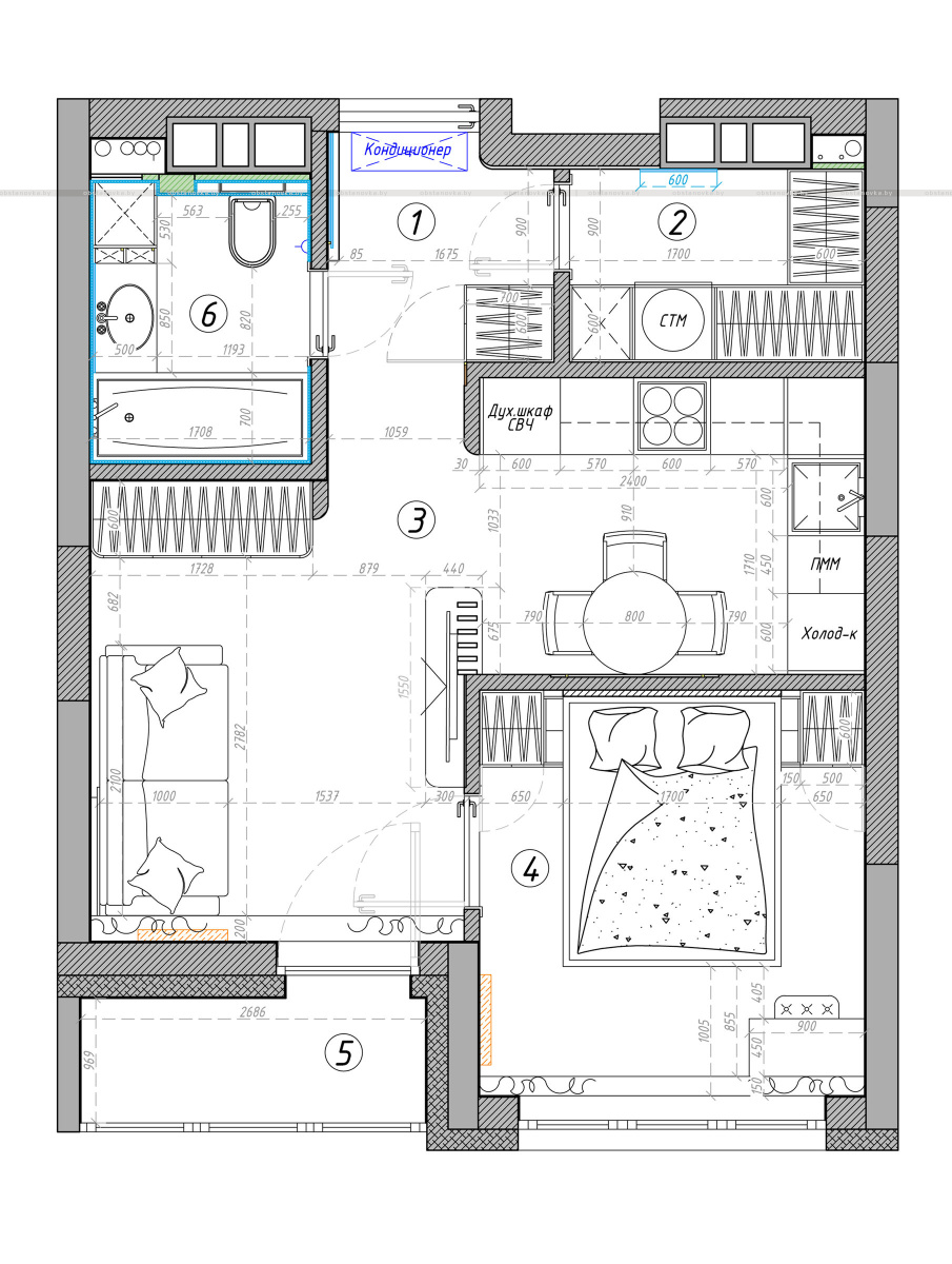 Тут мы скомпоновали холл, гардероб, санузел (+ скрытый личный туалет для кота со входом из холла), кухню, гостиную, спальню и лоджию.