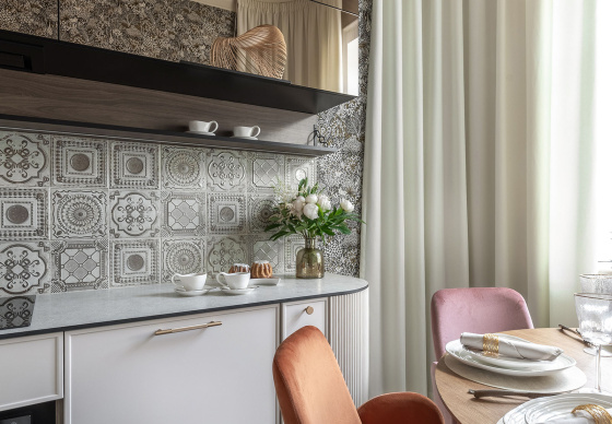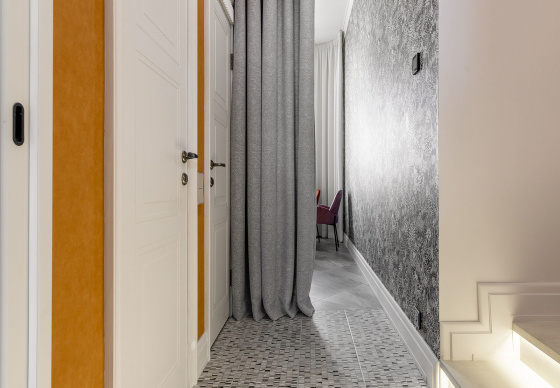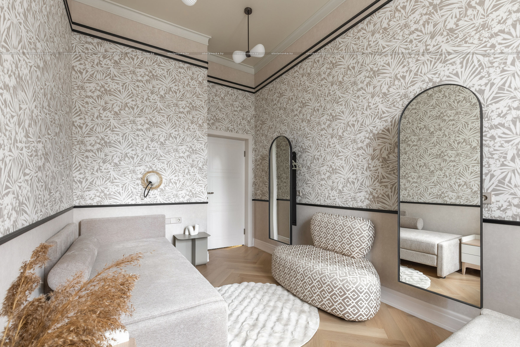 За основу взята спокойная, выдержанная цветовая палитра, которая служит идеальным фоном для архитектурных элементов. Динамику и современность вносят контрастные линейные акценты, фокусируя внимание на деталях. Интерьер получил ретро-настроение и творческую душу, избежав прямого копирования старины.