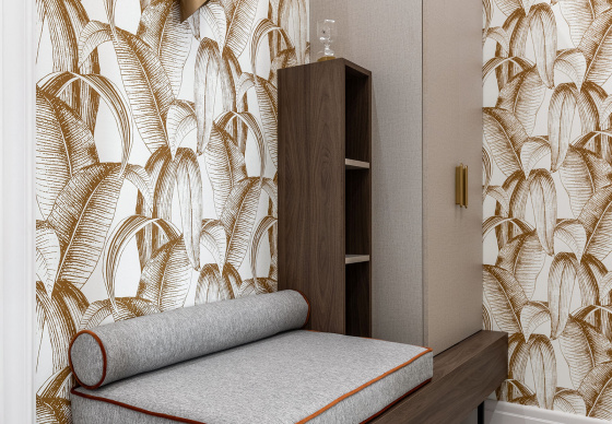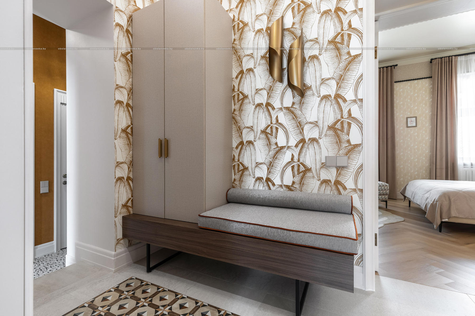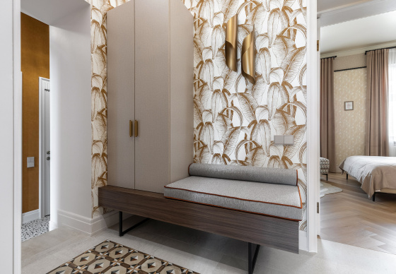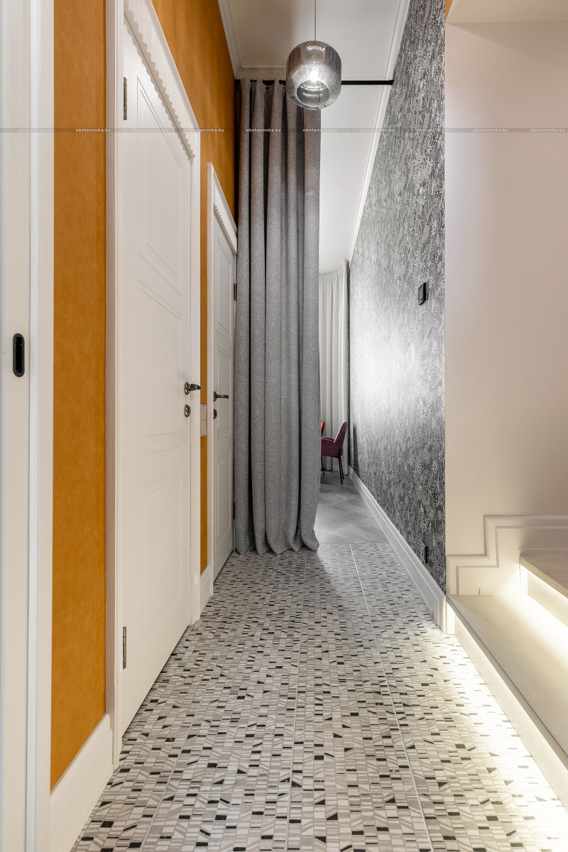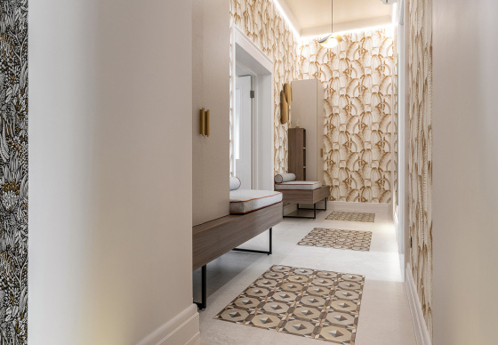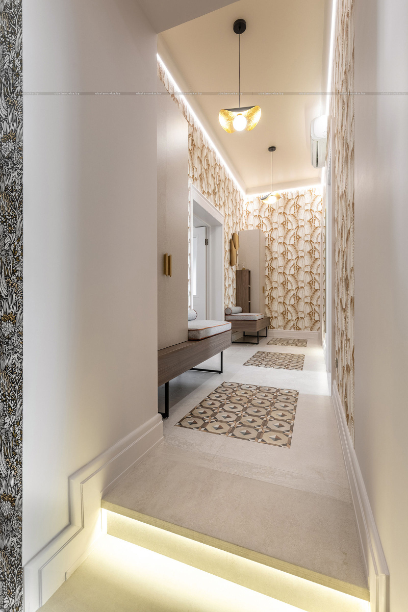 Коридор, как парадная. С красиво выложенными коврами из керамической плитки, парящими шкафами и необычными скамьями.
