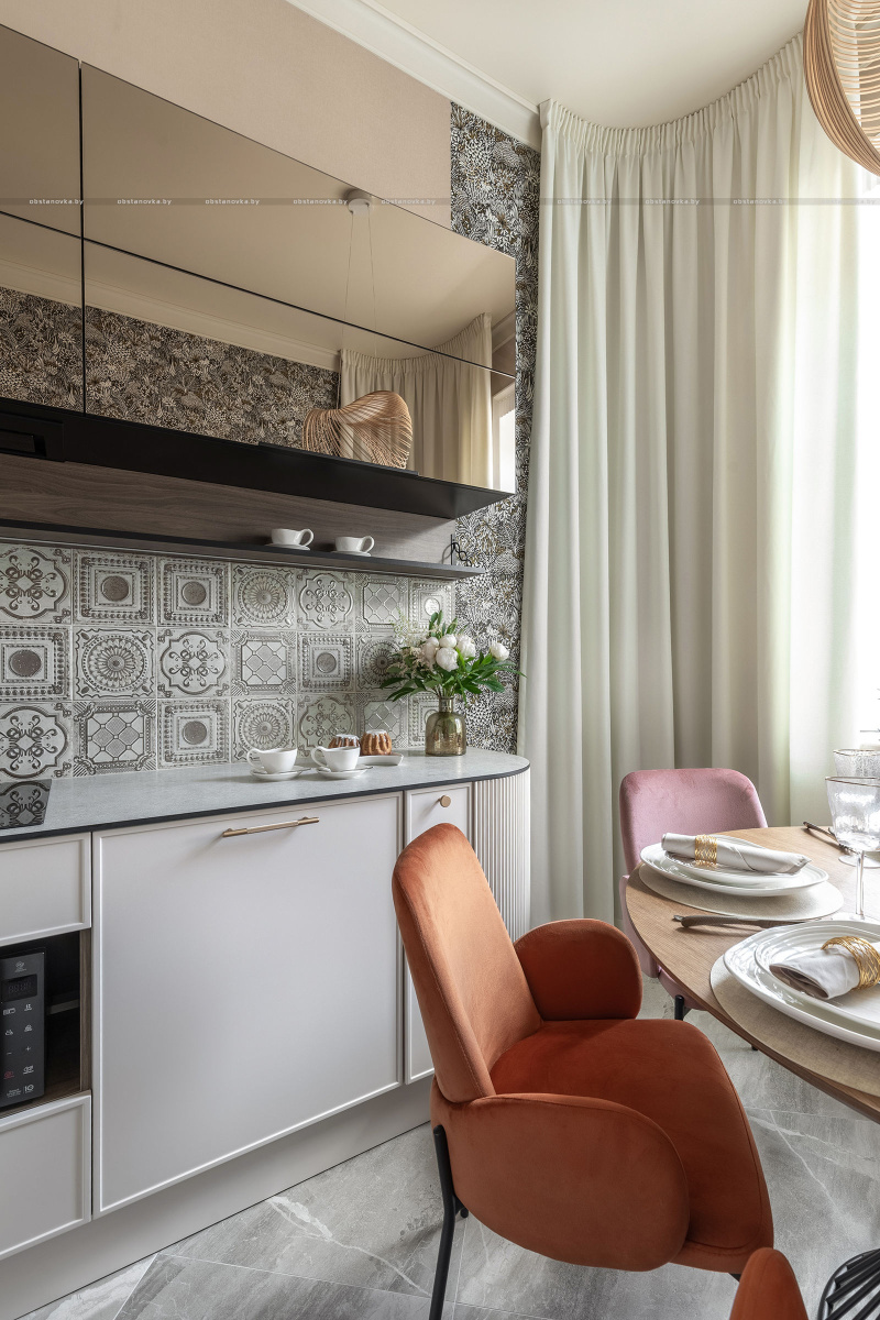 Интересным решением стали радиусные карнизы. Применение мягких радиусных карнизов не в эркерах, а в углах гостиной и кухни создало необычный, «обнимающий» эффект для штор, добавляя интерьеру пластичности и интриги.