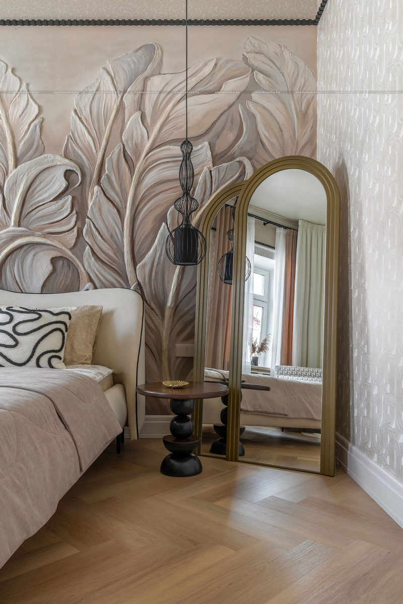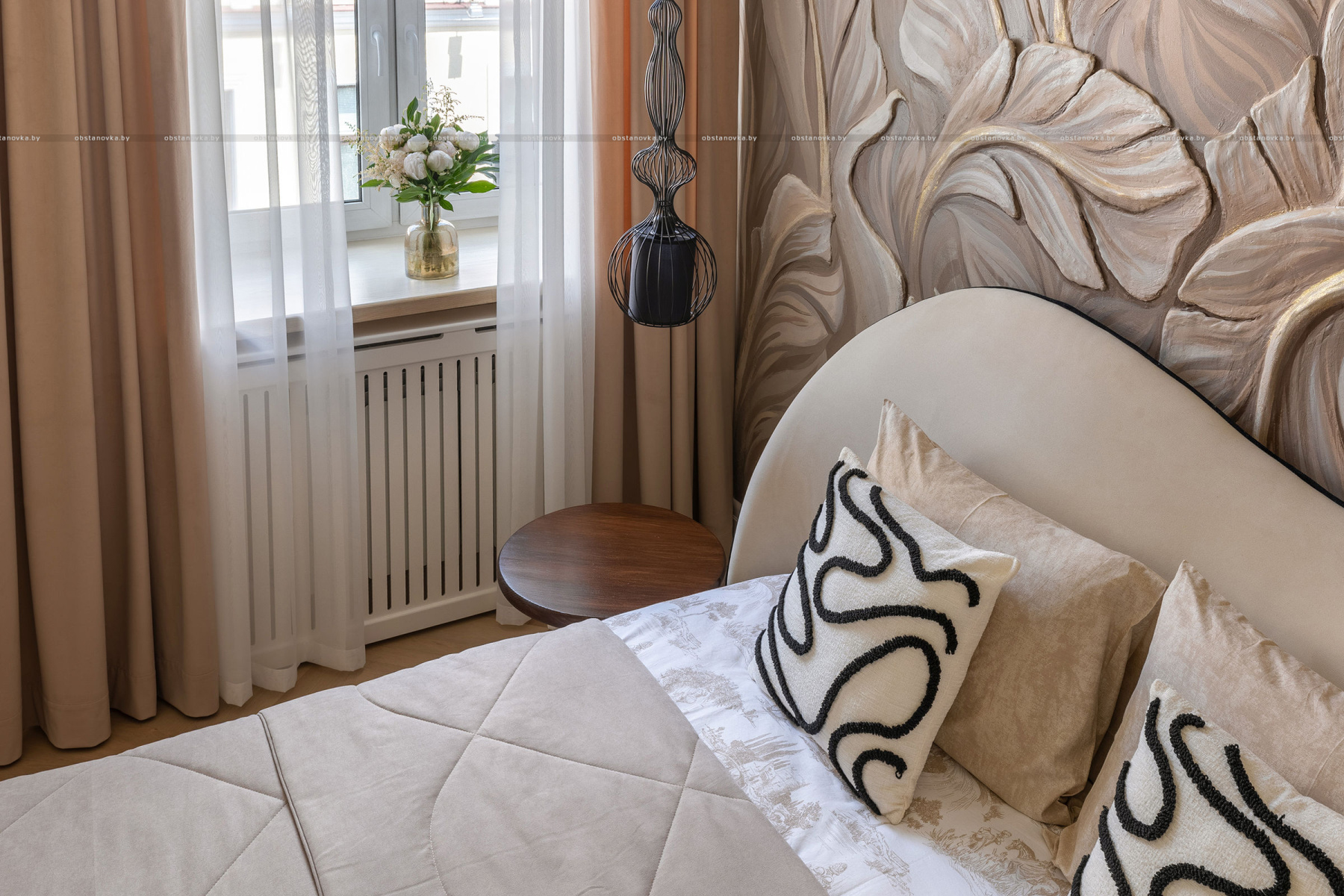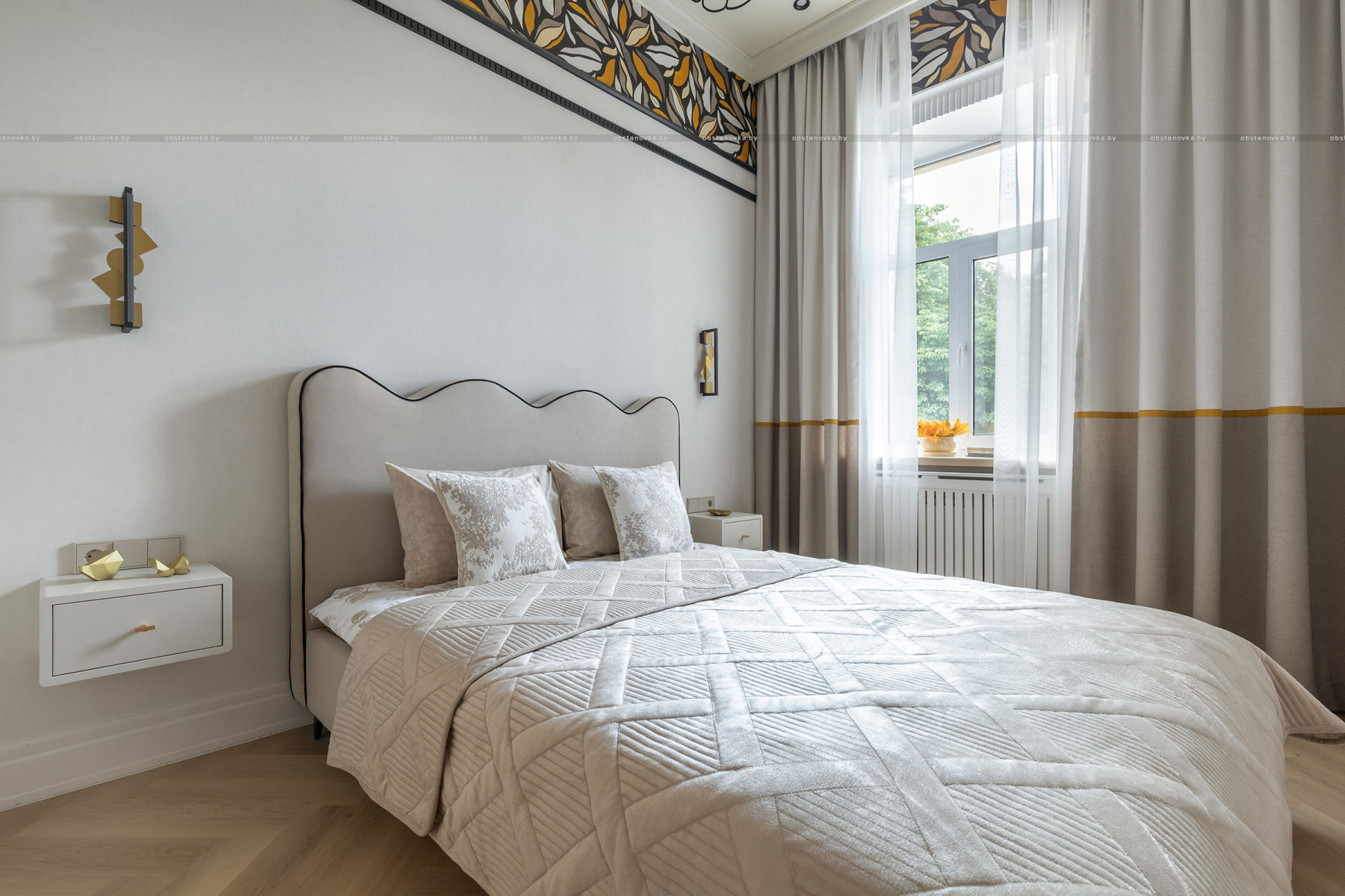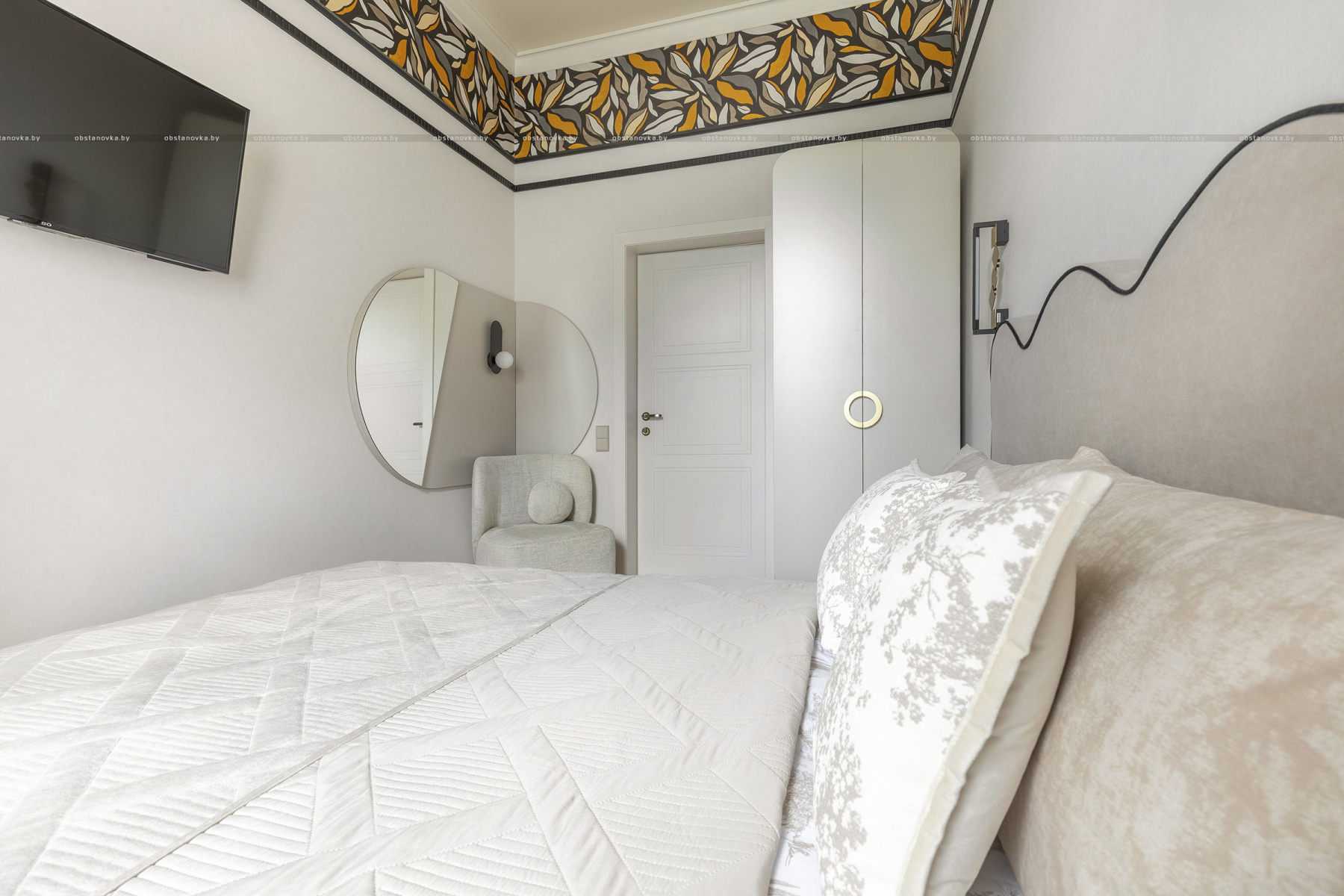 Плавные формы, заданные мягкими линиями карнизов, нашли свое продолжение во всей мебели — от изголовий кроватей и кресел до фасадов шкафов и тумб. Это объединило пространство и сделало его гармоничным.