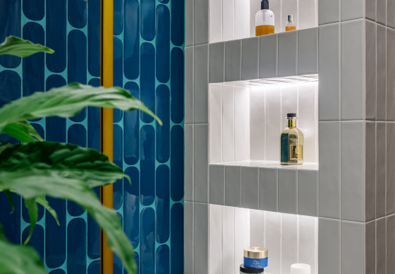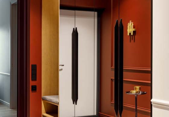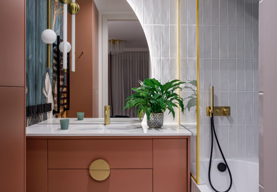 Основное внимание привлекают мозаика из итальянской плитки Ce.Si. Ceramica на полу и яркая стена винного цвета английского бренда краски PPL, создающие эффектный акцент.