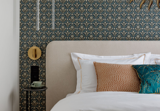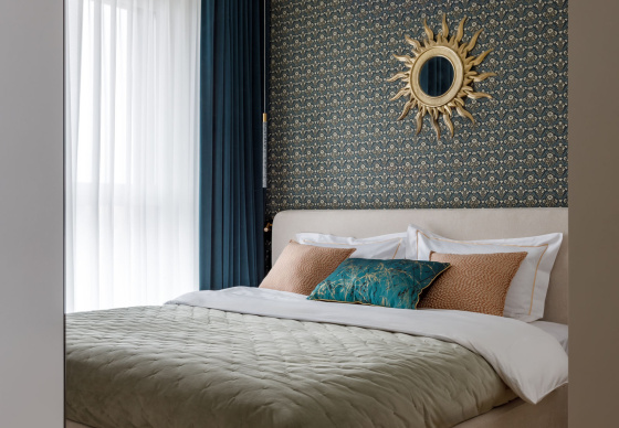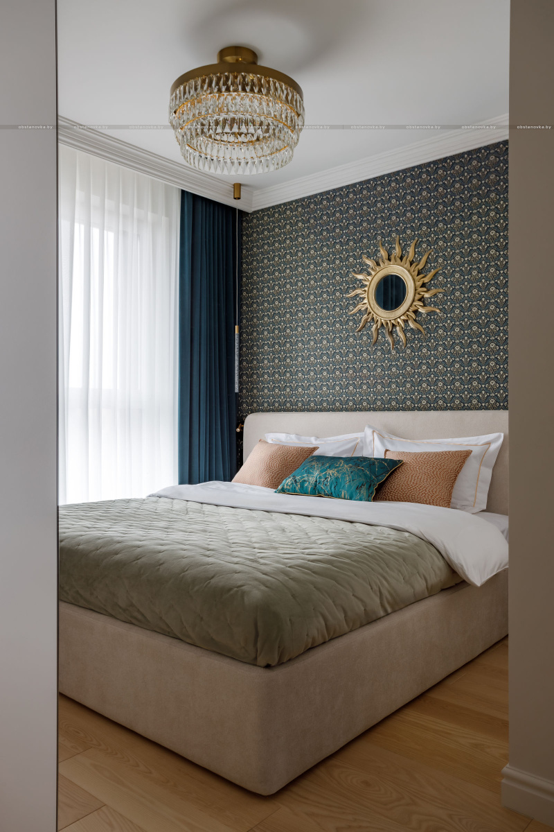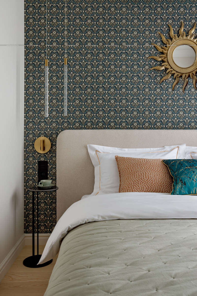 В спальне мы создали микс английской классики PPL с обоями от Morris и современными формами кровати, что придаёт помещению элегантный вид.