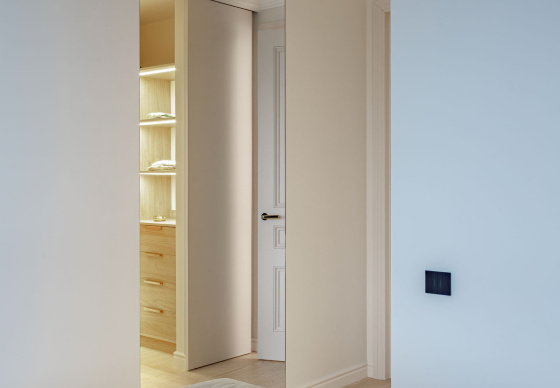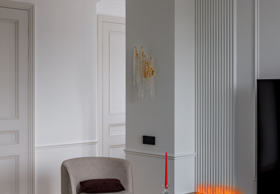 Для оптимизации пространства в гардеробной мы заменили напольный радиатор на вертикальный дизайнерский Zehnder.