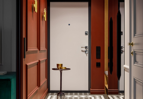 Для входной зоны мы использовали зеркальное графитовое стекло, которое добавляет лёгкости и визуально расширяет пространство.