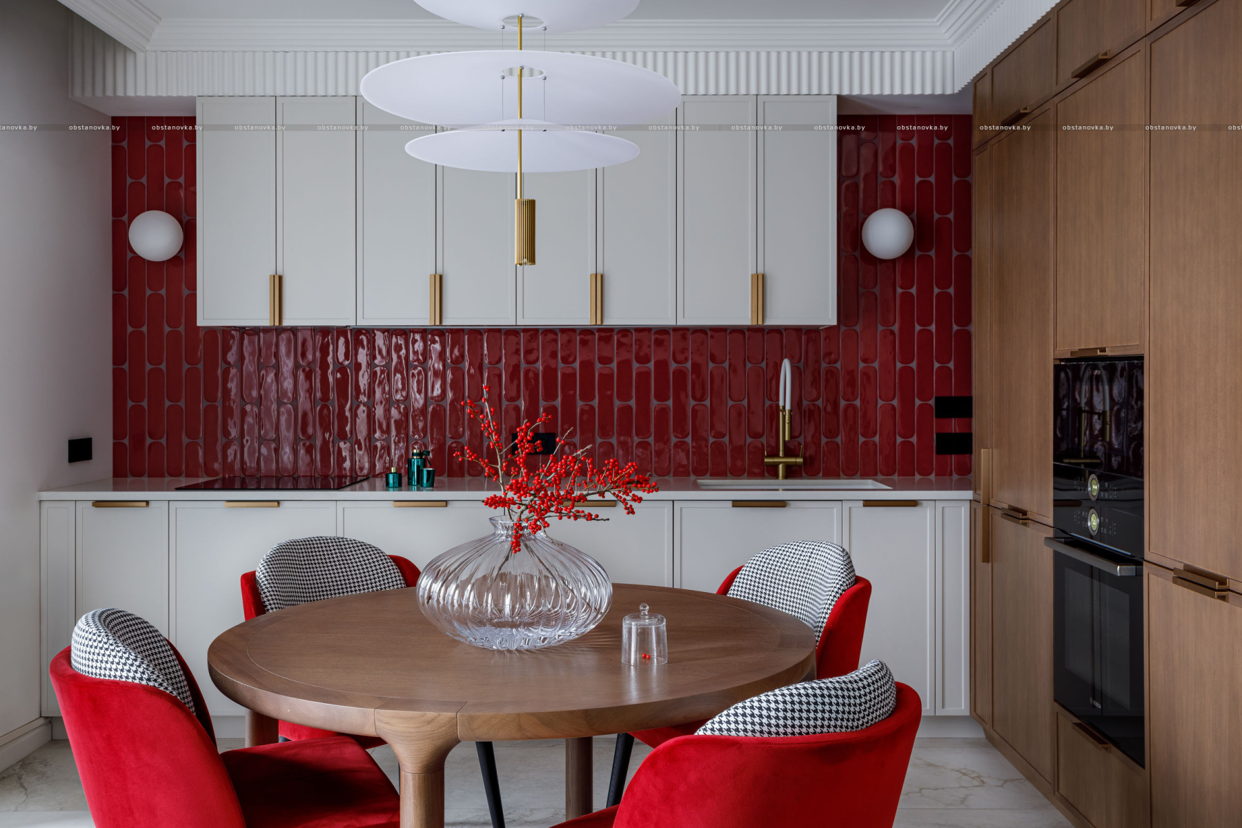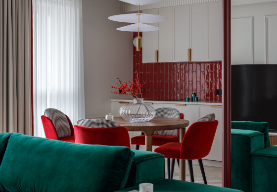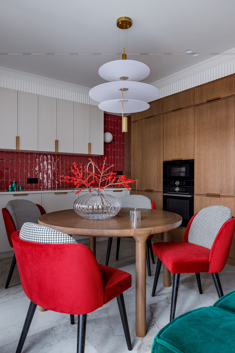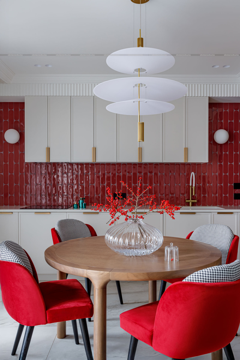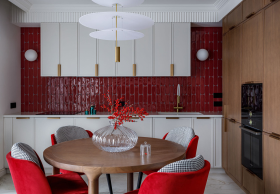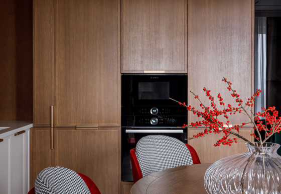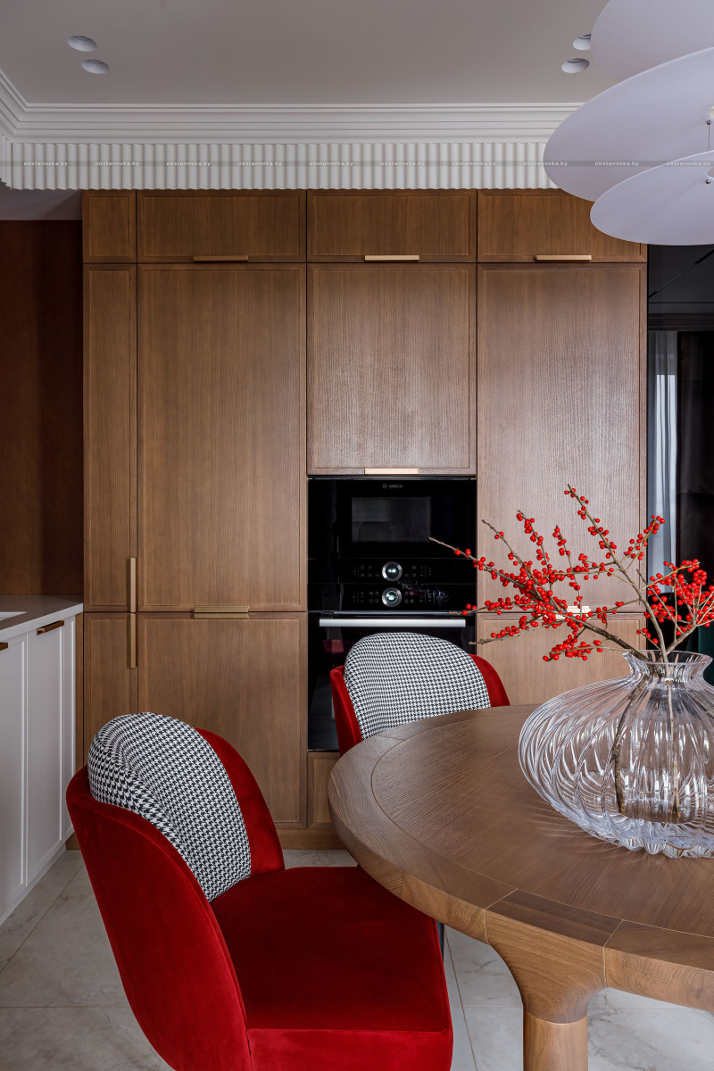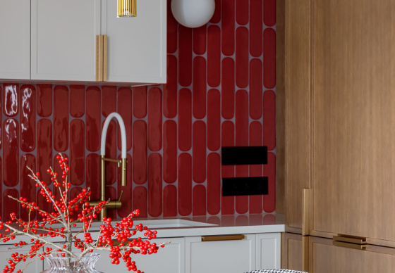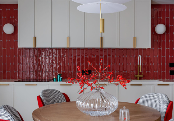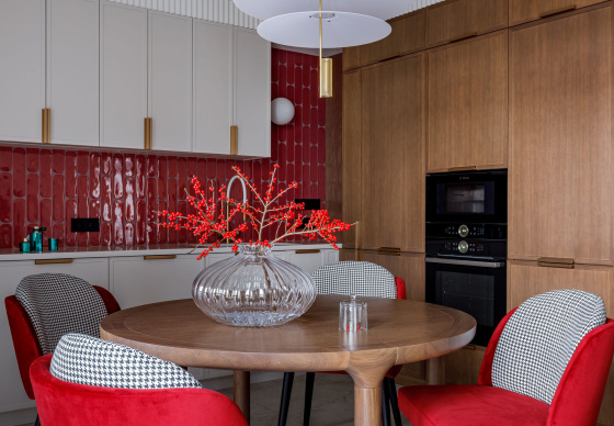 В жилых зонах мы выбрали паркет Finex из ясеня в натуральном оттенке, который создаёт тёплую и уютную атмосферу благодаря своему красивому рисунку. Кухня стала центром внимания благодаря малиновому фартуку из коллекции Grace бренда WOW, который гармонично сочетается со шпонированными фасадами из дуба и нейтральными элементами из керамогранита от Coem.