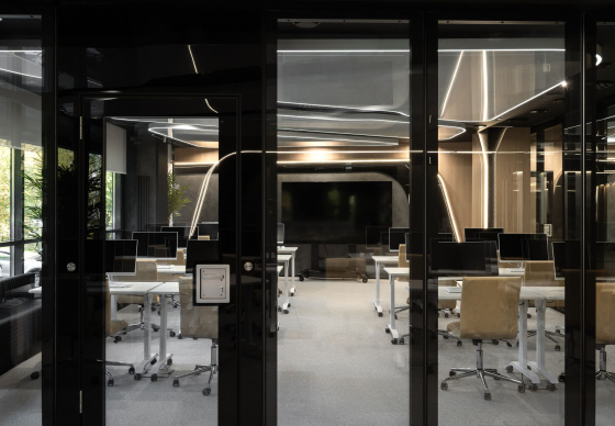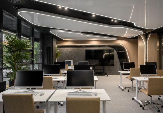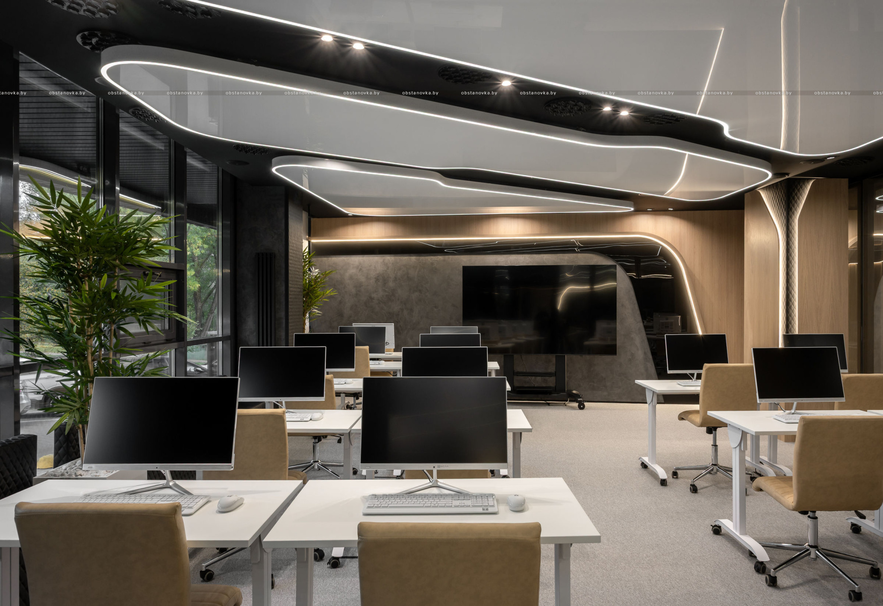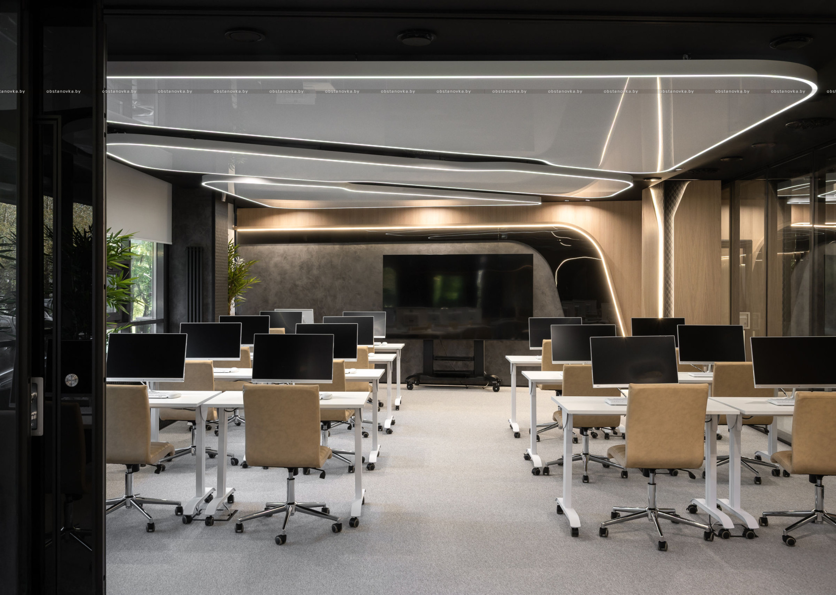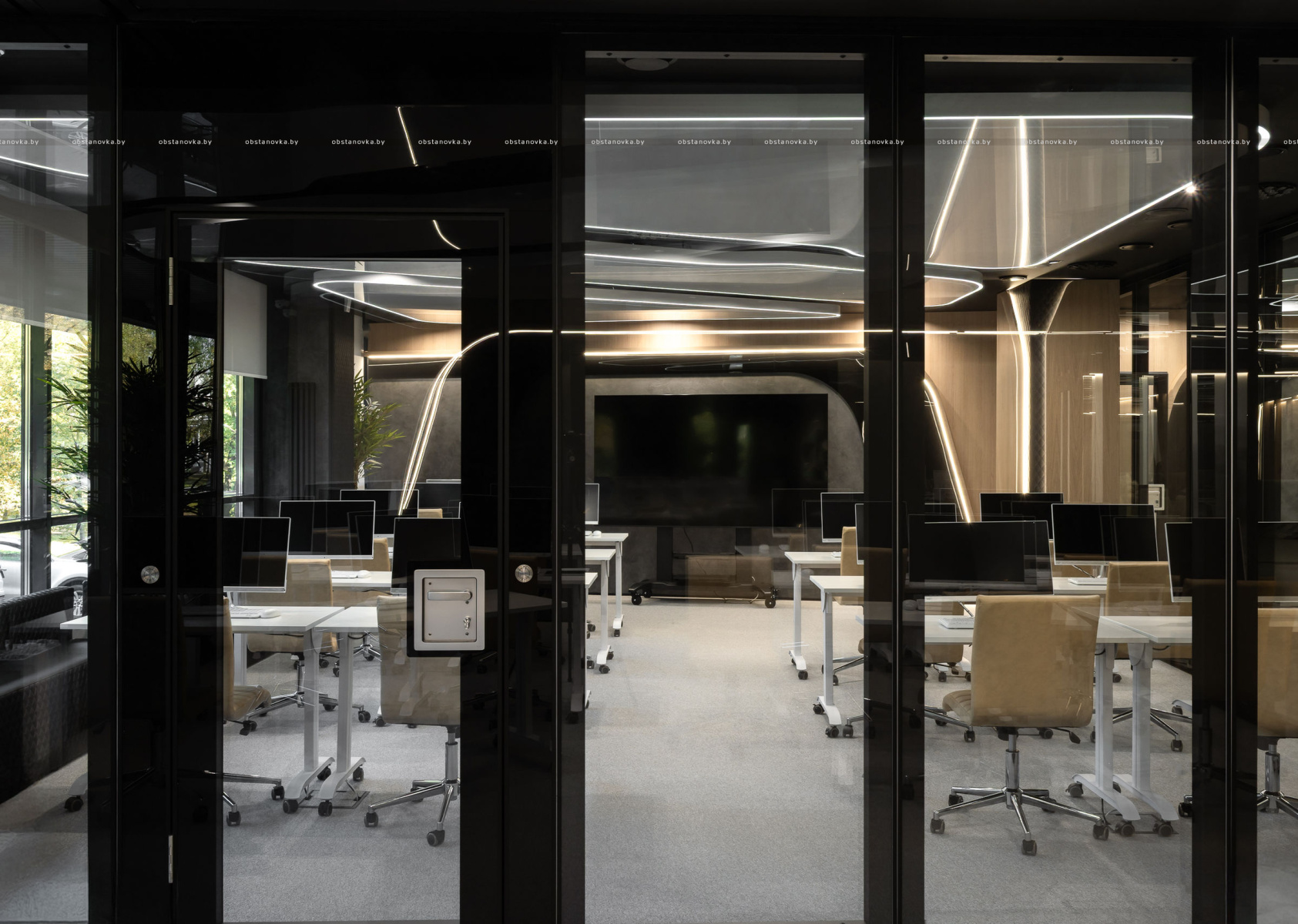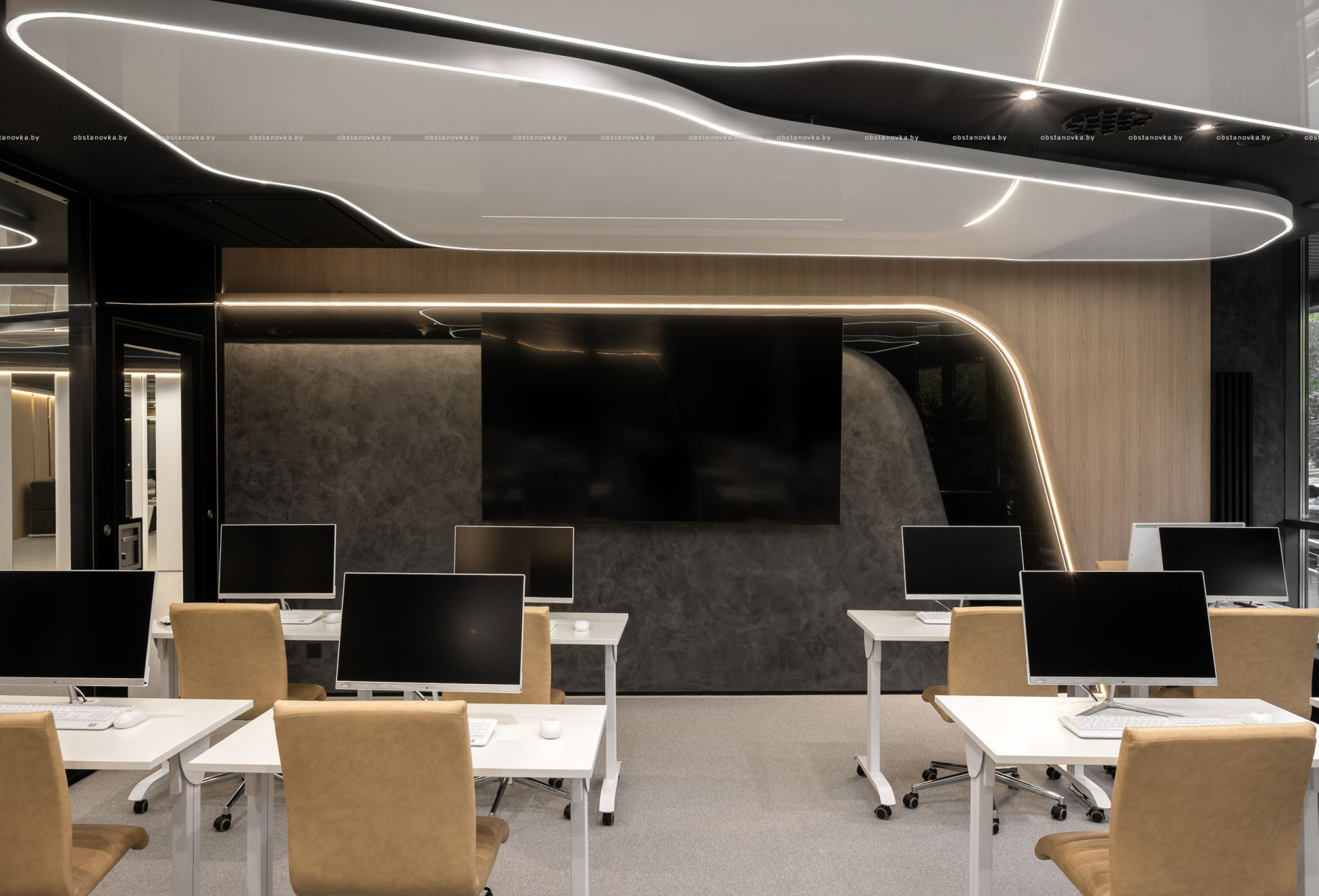 Интерьер представляет собой современный компьютерный центр с залом для переговоров. Помещение оборудовано всем необходимым для проведения встреч, совещаний и учебных мероприятий.