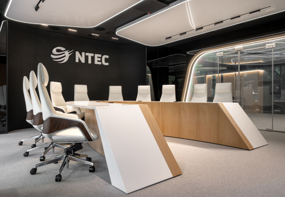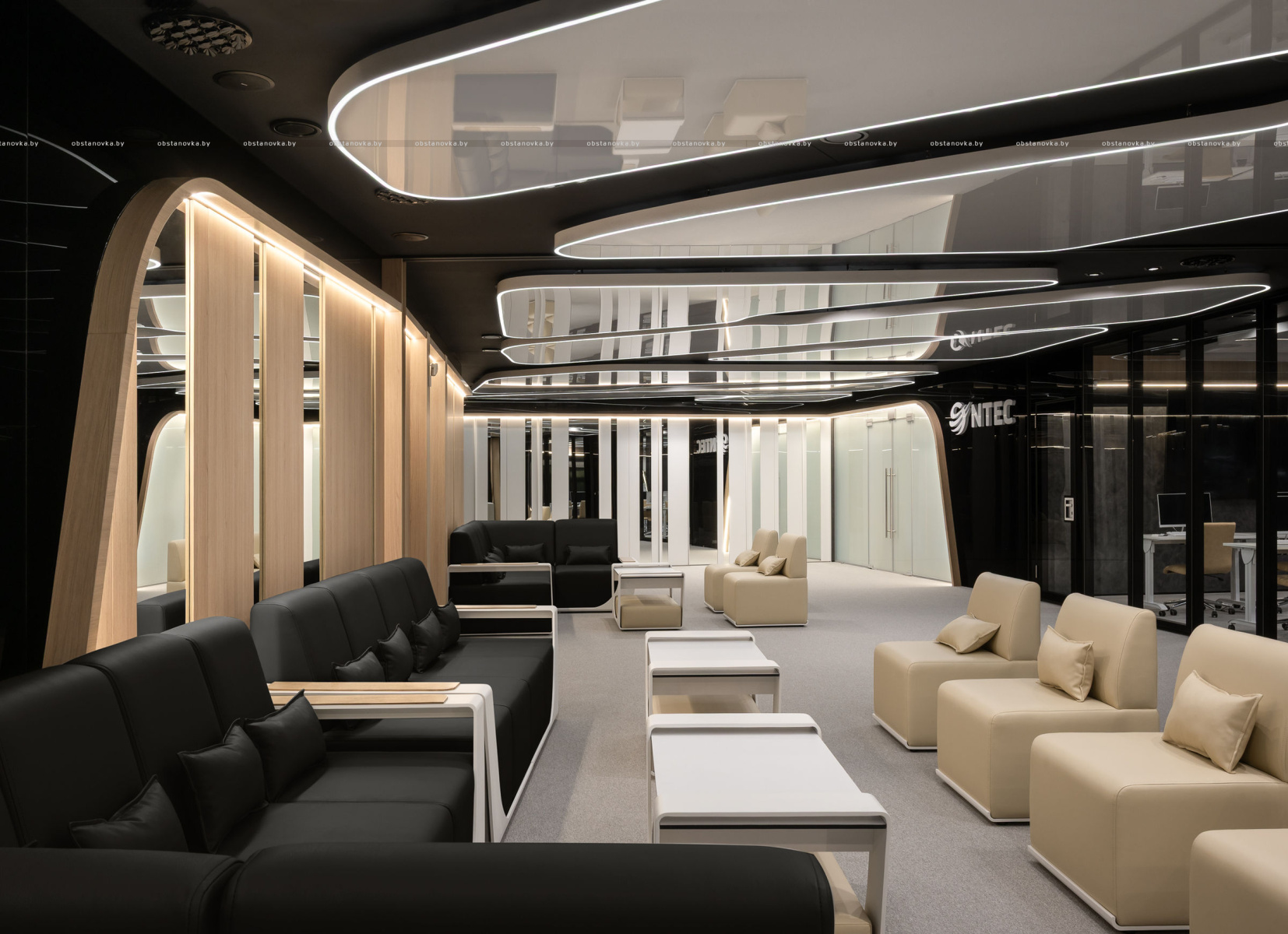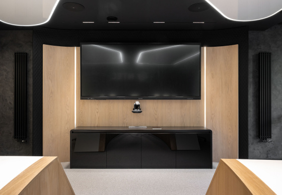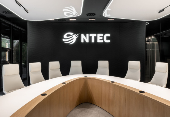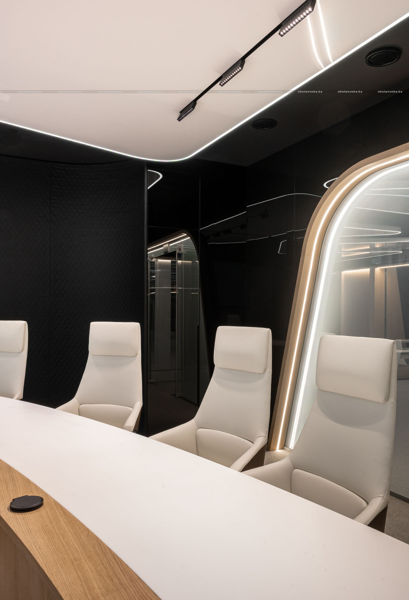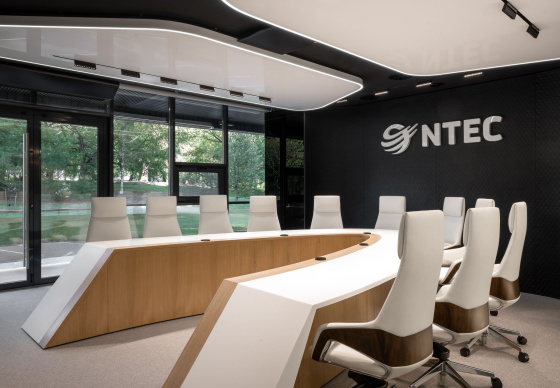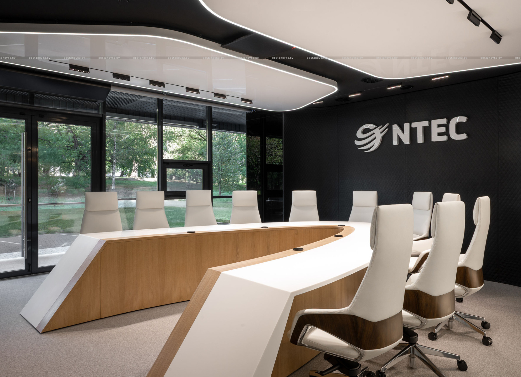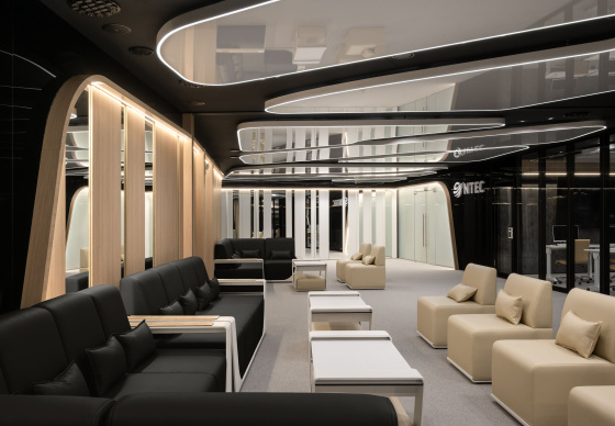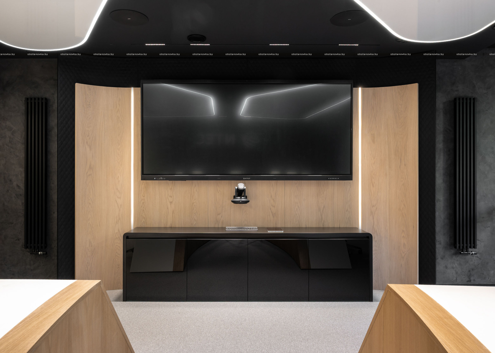 Интерьер представляет собой современный компьютерный центр с залом для переговоров. Помещение оборудовано всем необходимым для проведения встреч, совещаний и учебных мероприятий.