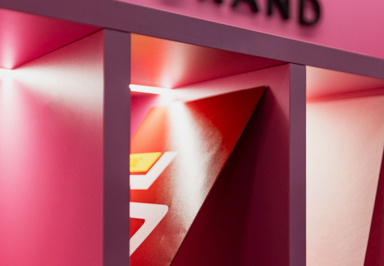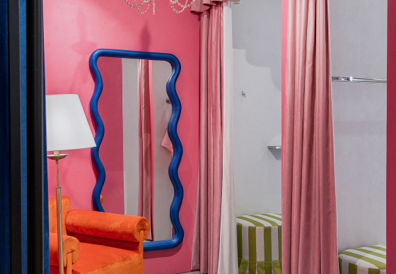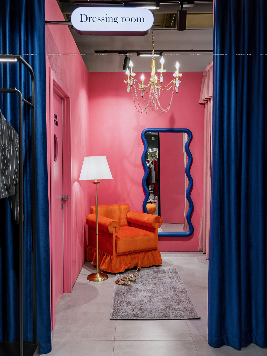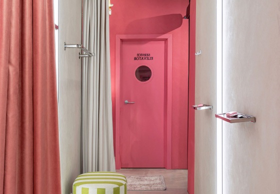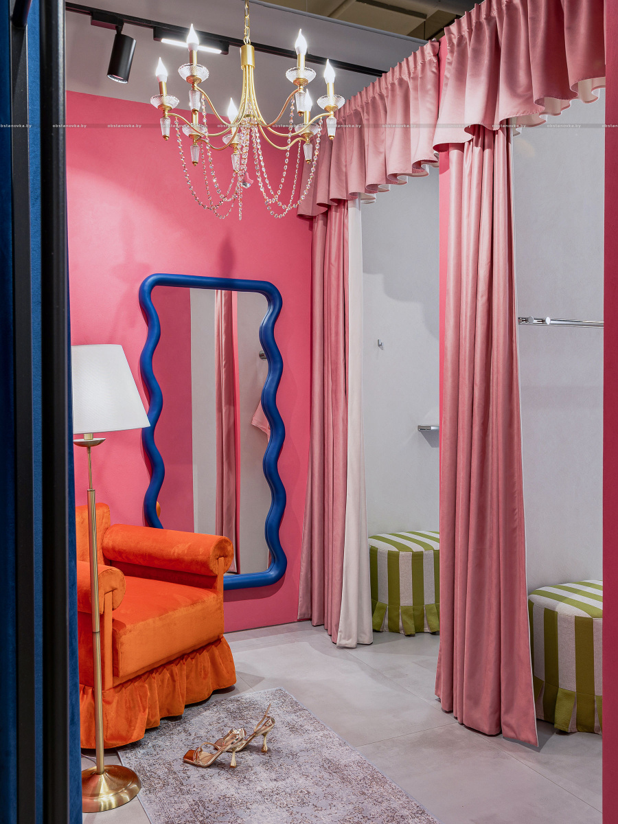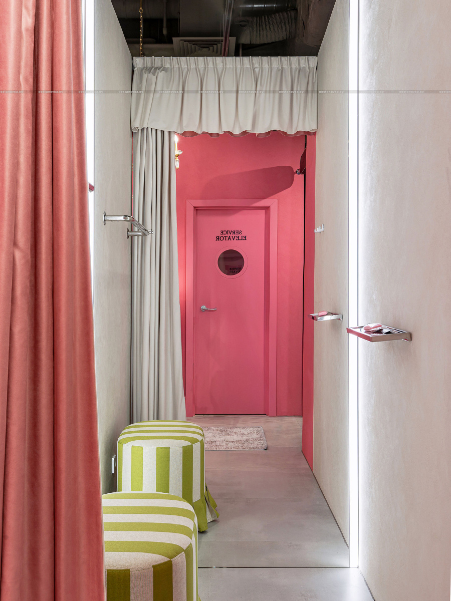 Самое вкусное в данном шоуруме — это будуарная зона для девочек! Где есть зона ожидания, примерок и селфи. Пуфы в салатовую полоску добавляют игривости пространству. Эффектным и смелым решением было сочетать розовый и оранжевый цвета! Также в данной зоне рядом располагается дверь служебного лифта, откуда будут выносить роскошные наряды!