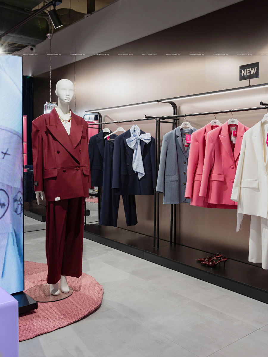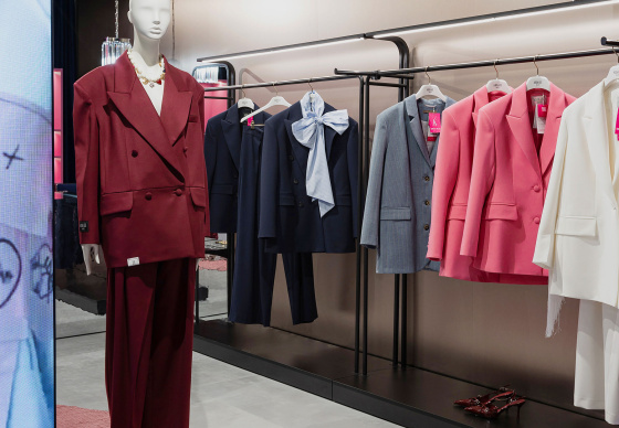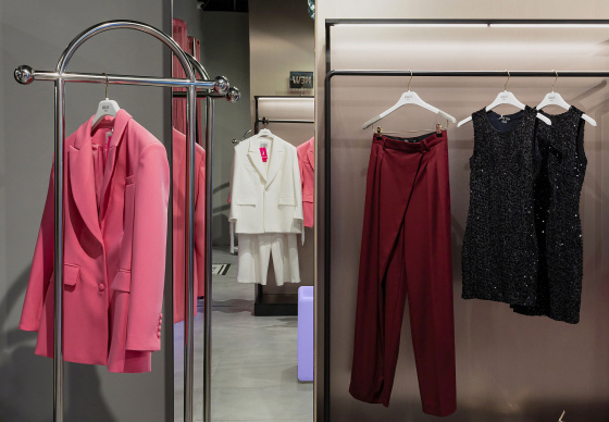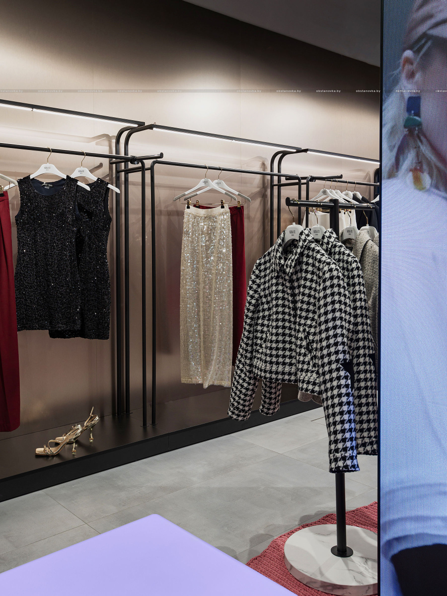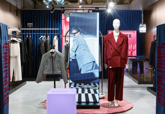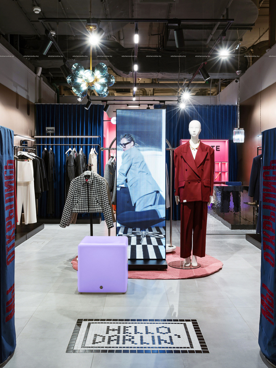 Для большего понимания, как смотрятся вещи в реальности, а не только на вешалке, мы интегрировали в пространство экран, где постоянно крутятся ролики с разными образами. И расположили рядом манекен, которому часто меняют наряды из новых коллекций.