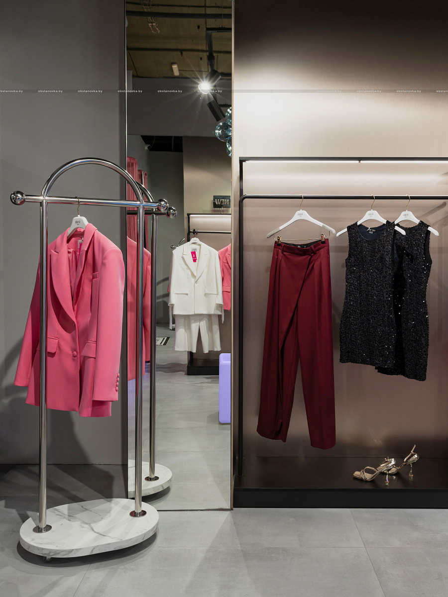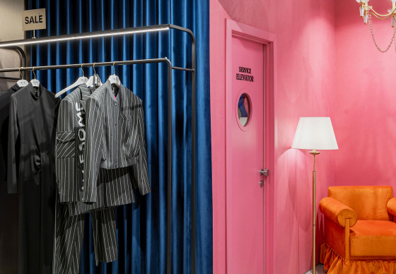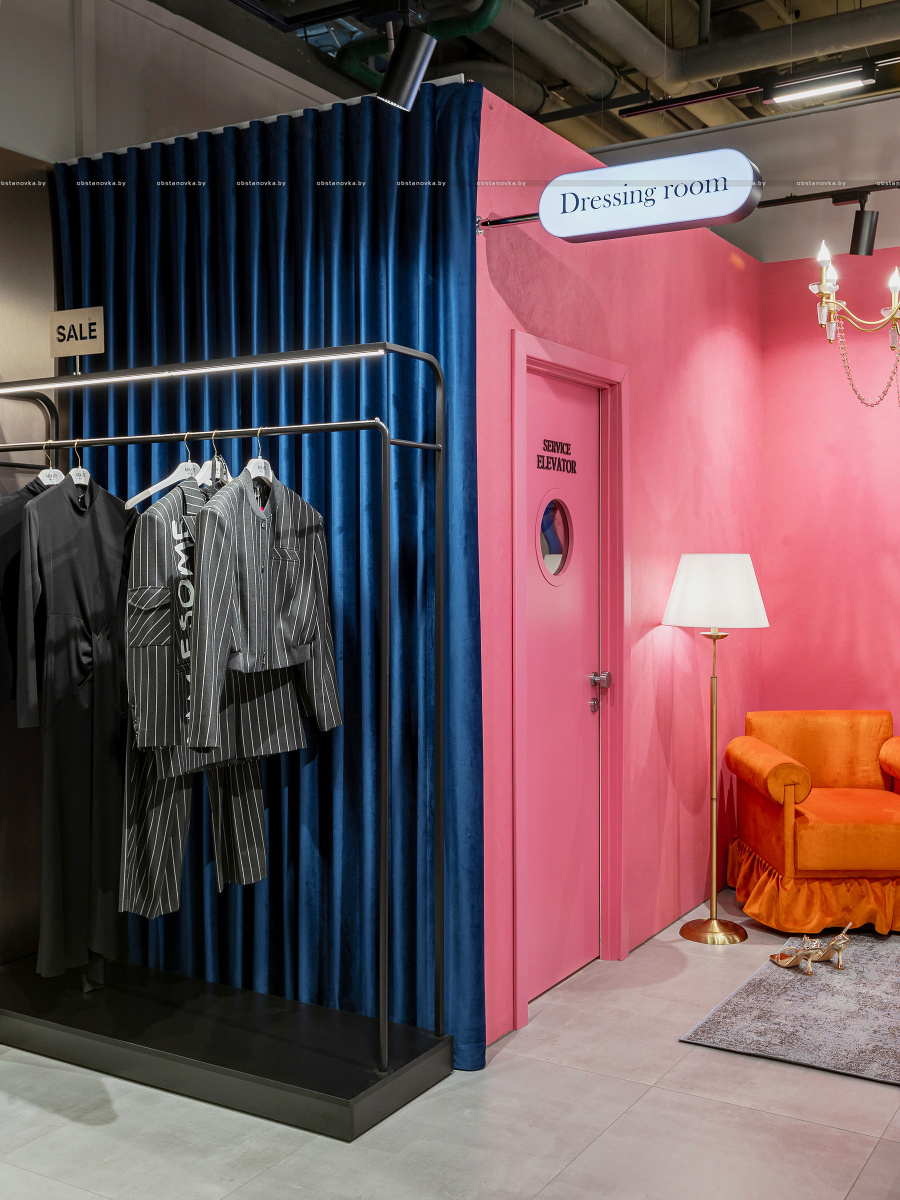 Также сохранились отельные перекатные тележки, но в современном исполнении. Можно гулять по шоуруму, вешать на них вещи и закатывать в примерочную.