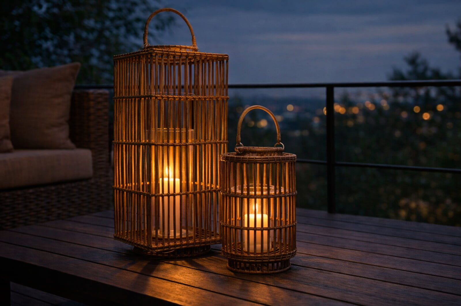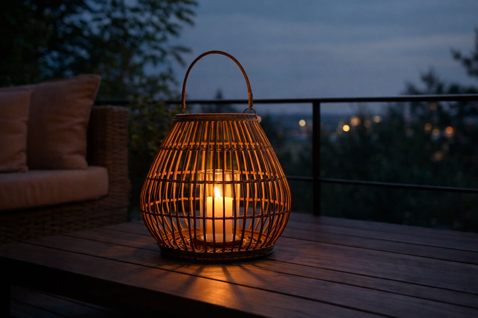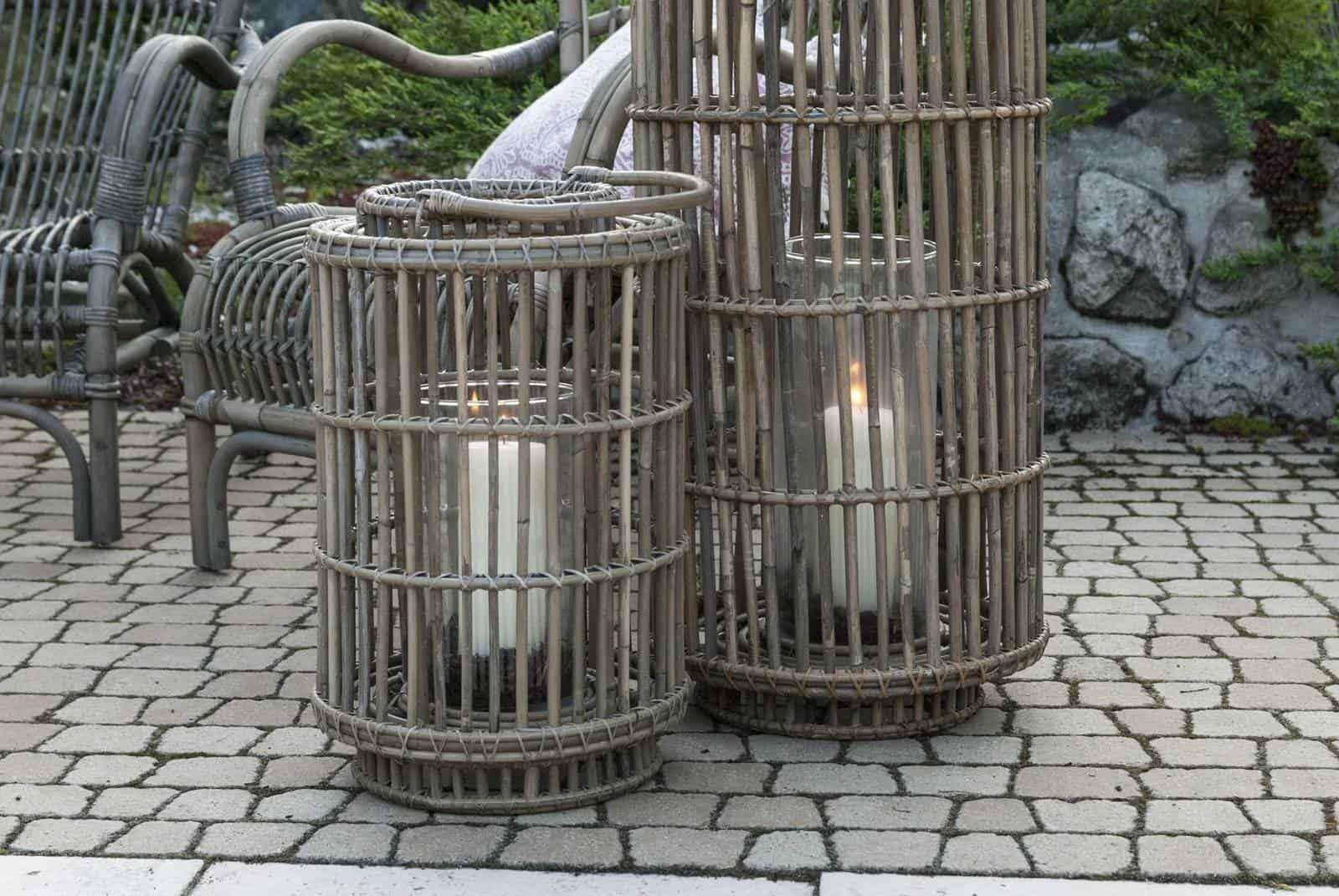 Внутри каждого лампиона предусмотрена колба из закаленного стекла для свечи. Такое решение обеспечивает безопасность и позволяет использовать как классические, так и ароматические свечи. В вечернее время лампионы создают теплый, живой свет, подходящий для камерных зон отдыха и атмосферных интерьерных решений.