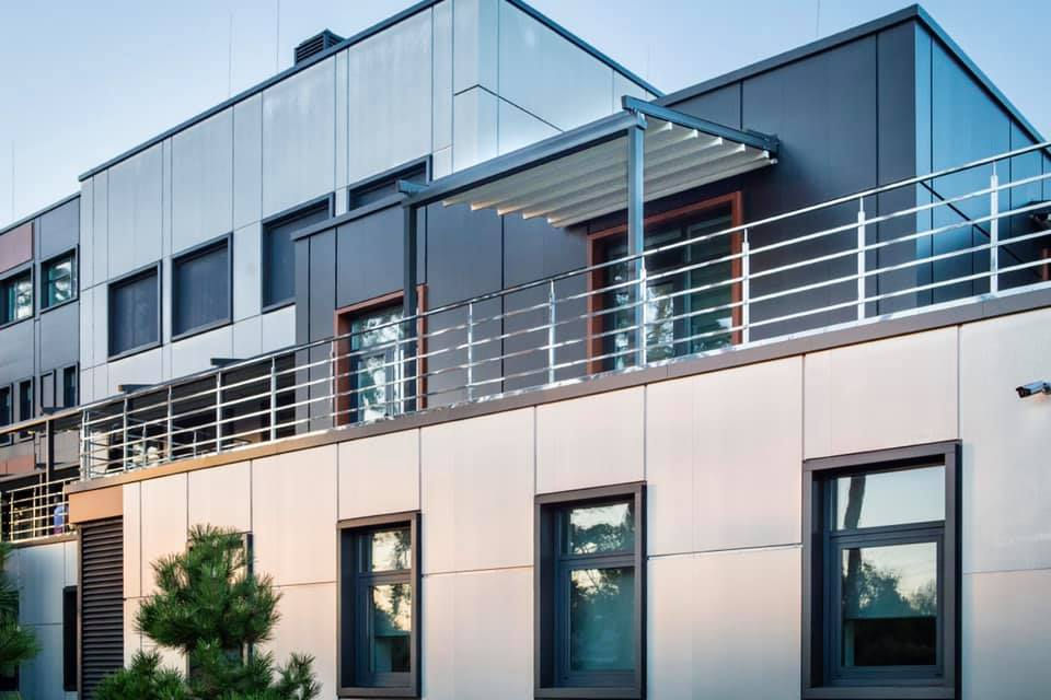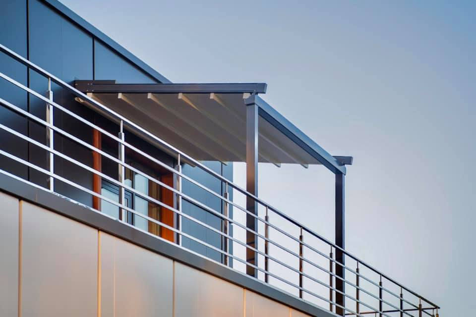 - Передний горизонтальный профиль с интегрированным желобом является несущим элементом для всей перголы и обеспечивает высокий уровень надежности и стабильности конструкции